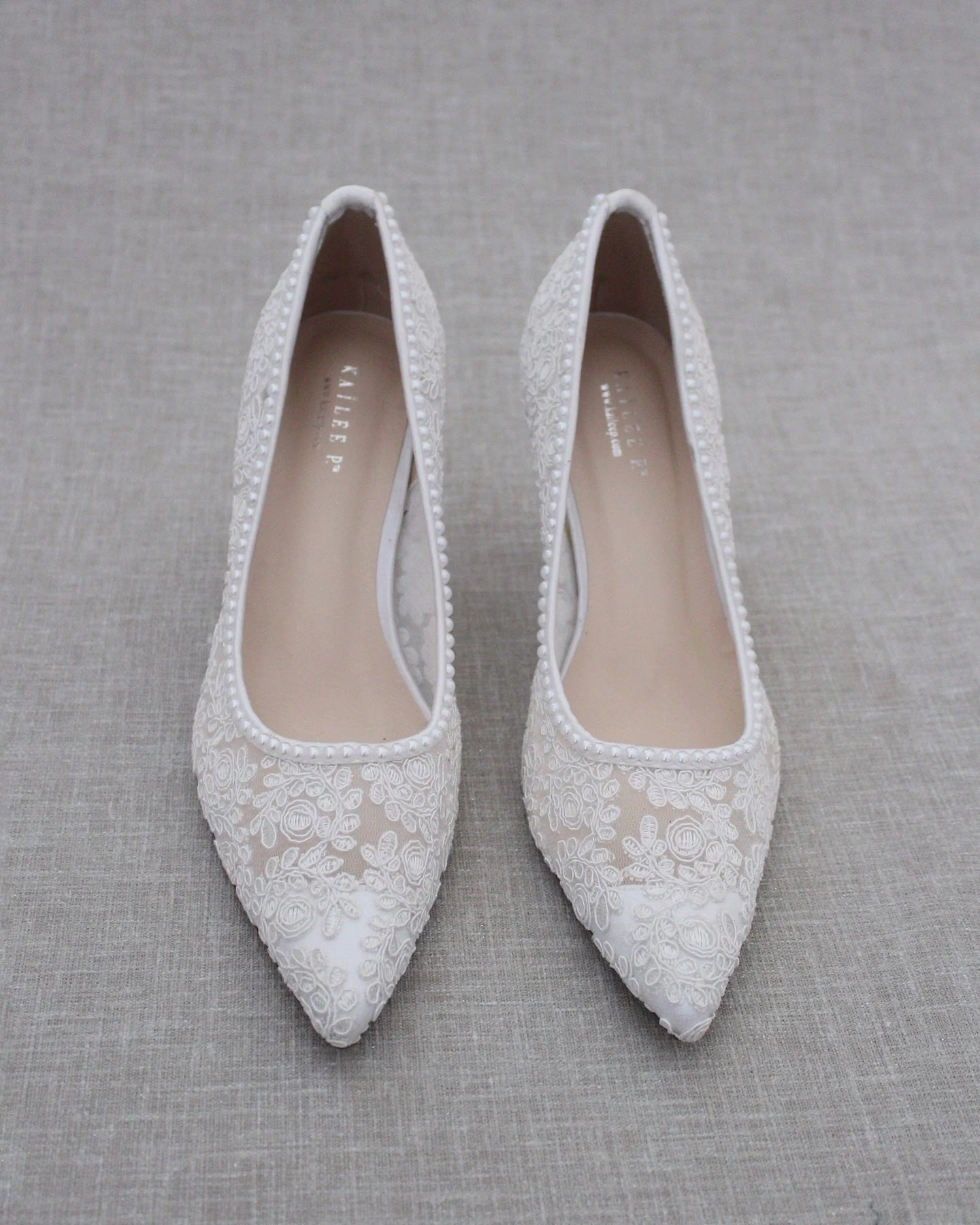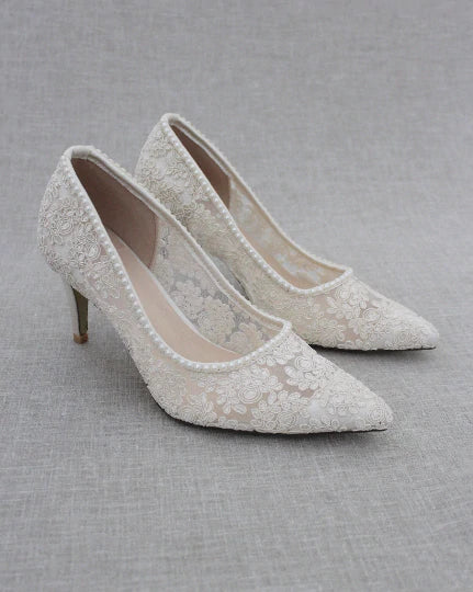 Hienostuneen herkällä köynnöskirjailulla sekä pienillä helmillä koristellut teräväkärkiset korkokengät. Yksinkertaisen tyylikkäät juhlakengät tai hääkengät elämäsi tähtihetkiin.