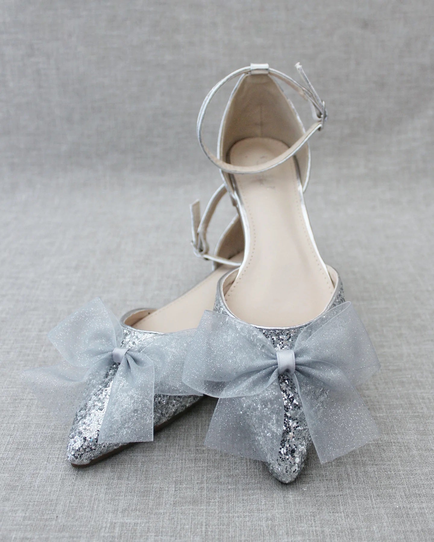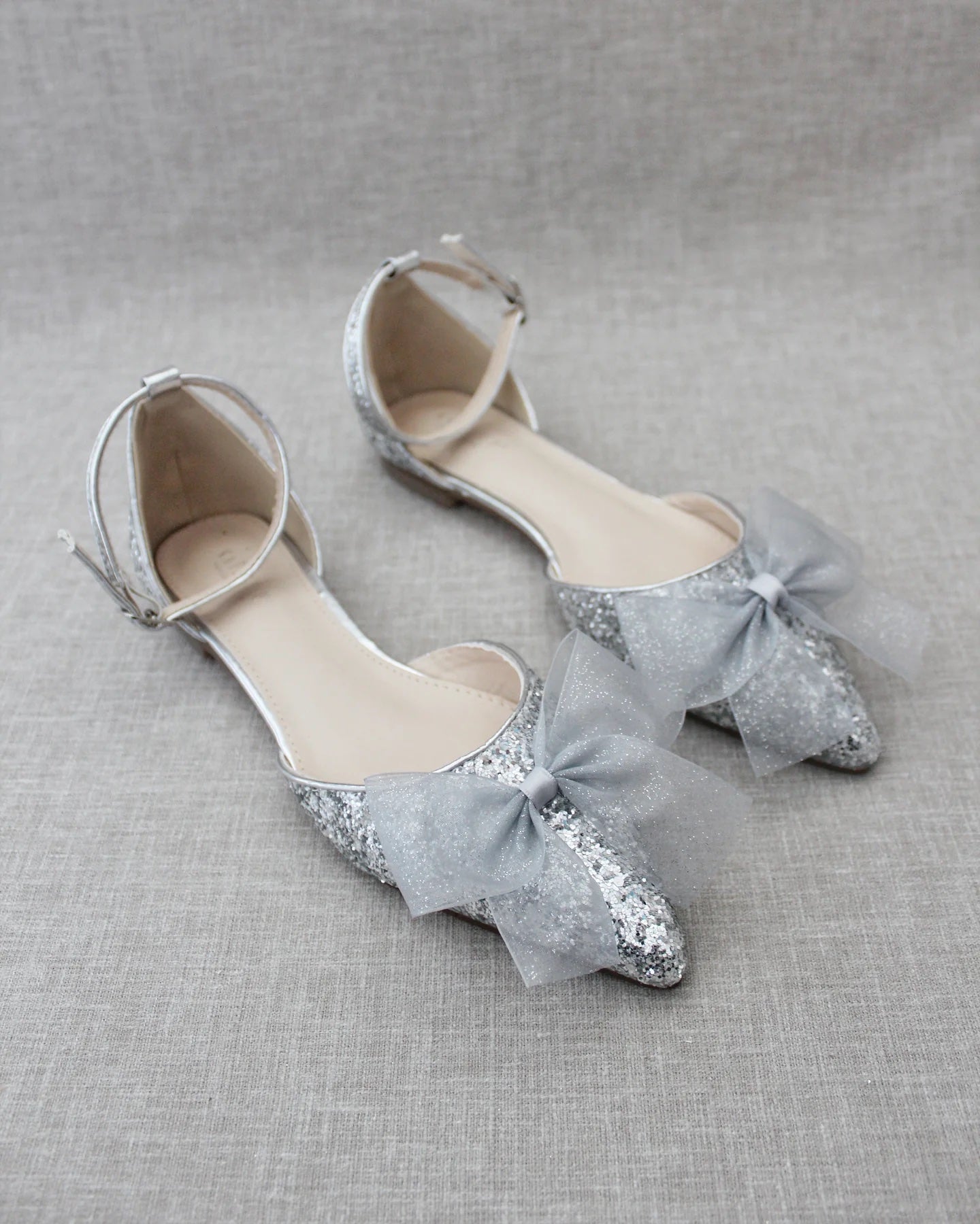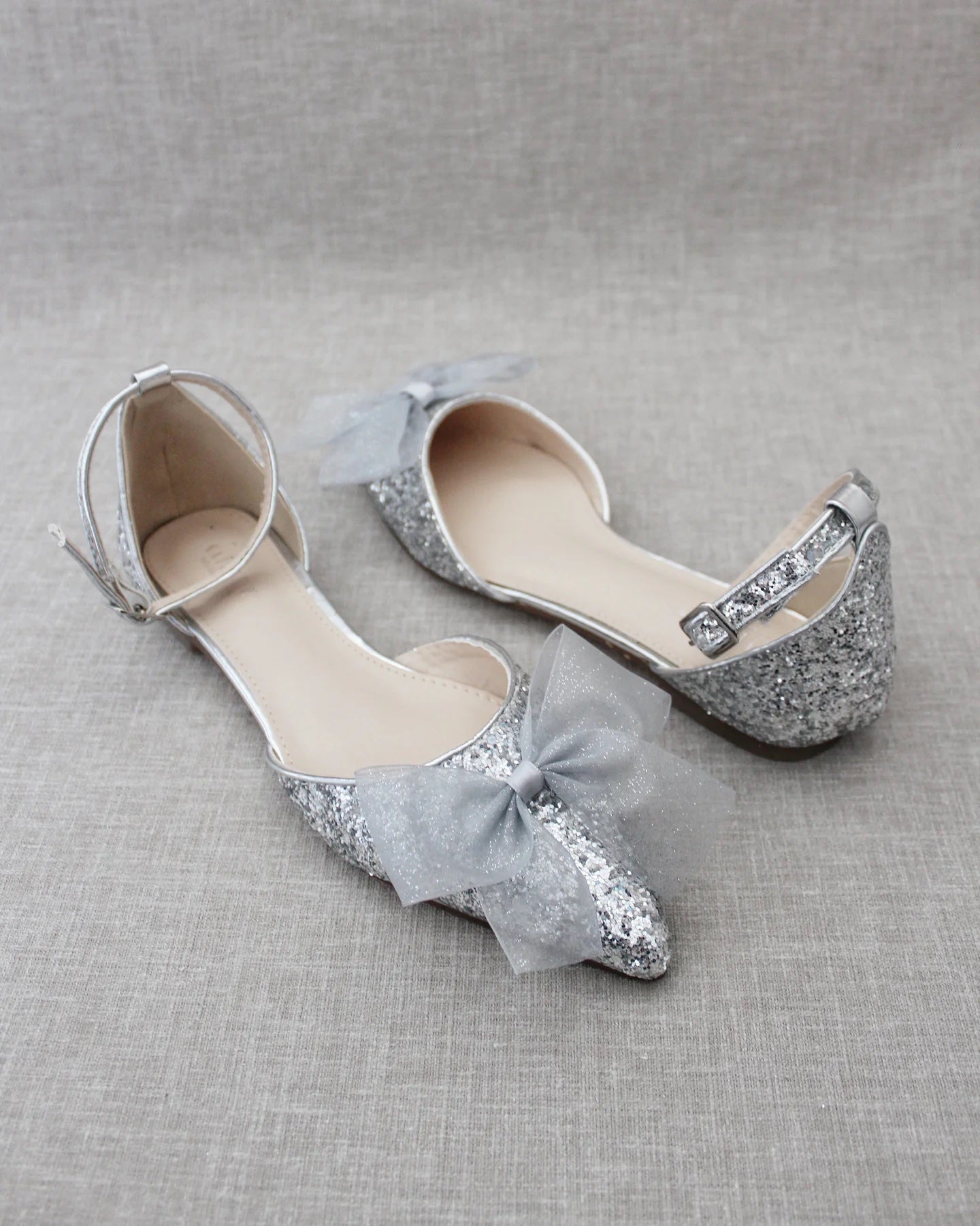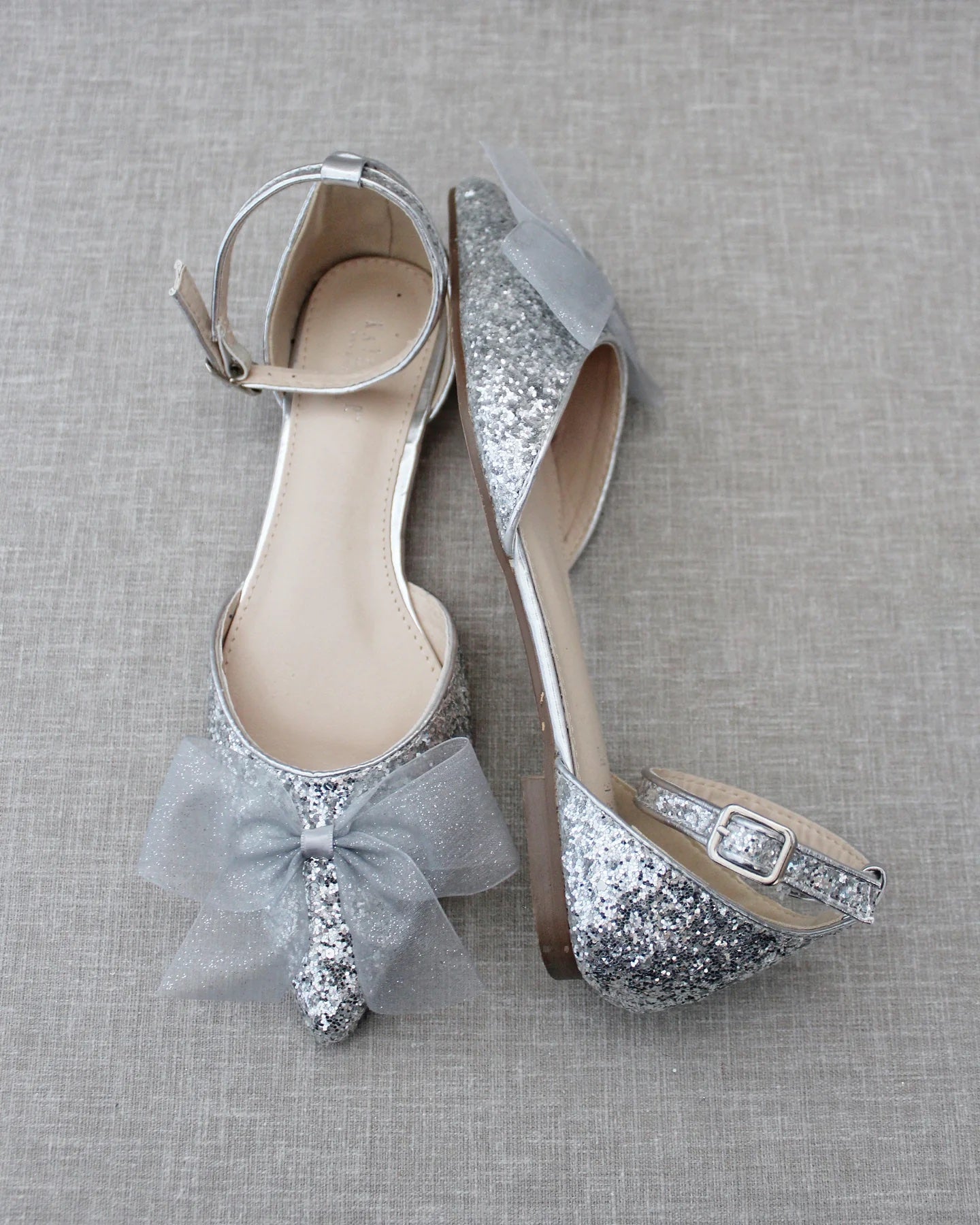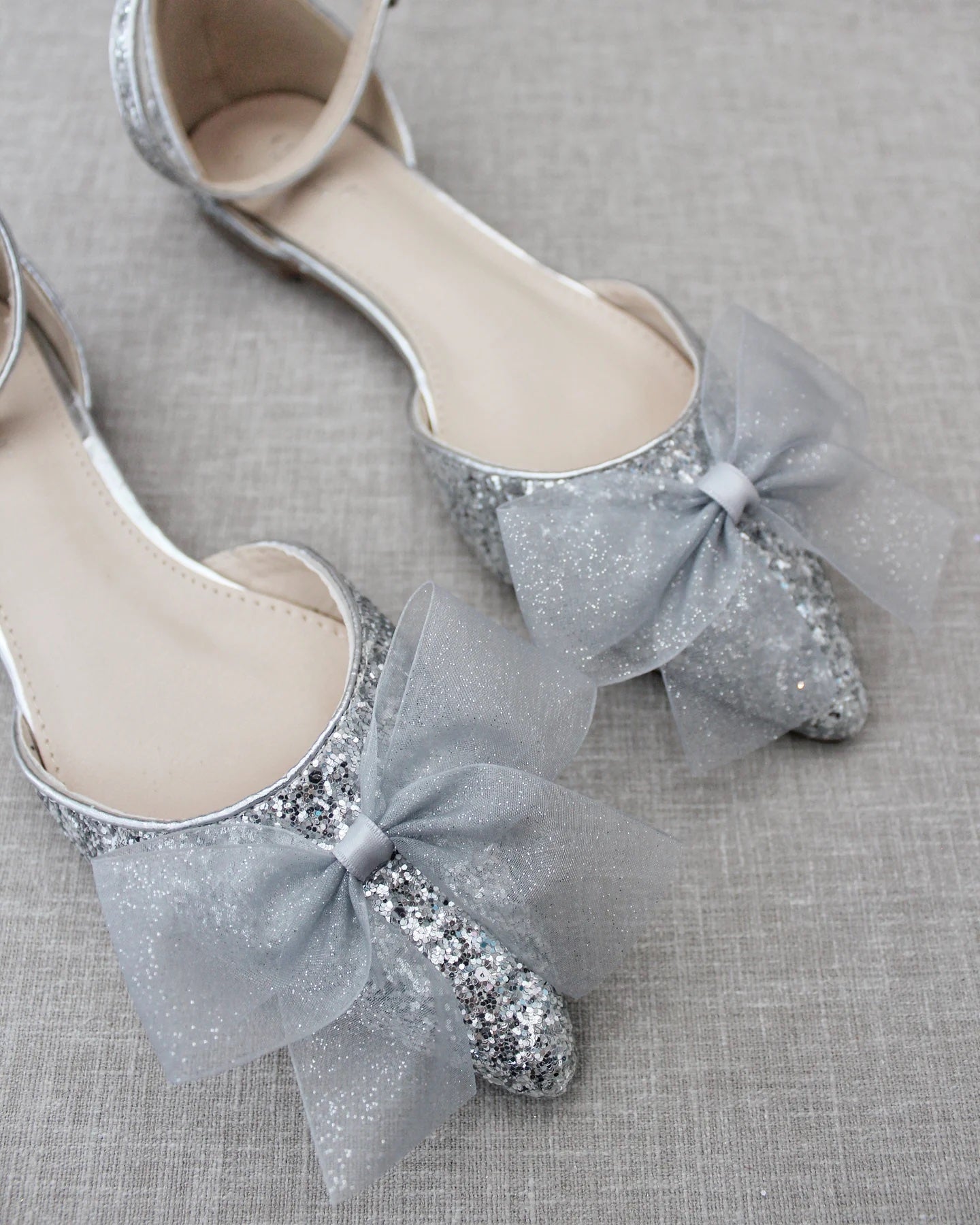 Sädehtivät matalat glitterjuhlakengät nilkkaremmillä ja rusetilla. Kengät häikäiseviin hetkiin niin toimistolle kuin juhlatilaisuuksiin. Saatavana mustalla ja hopeisella glitterpinnalla.