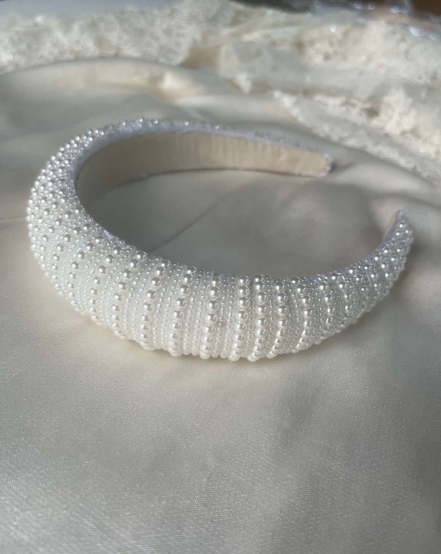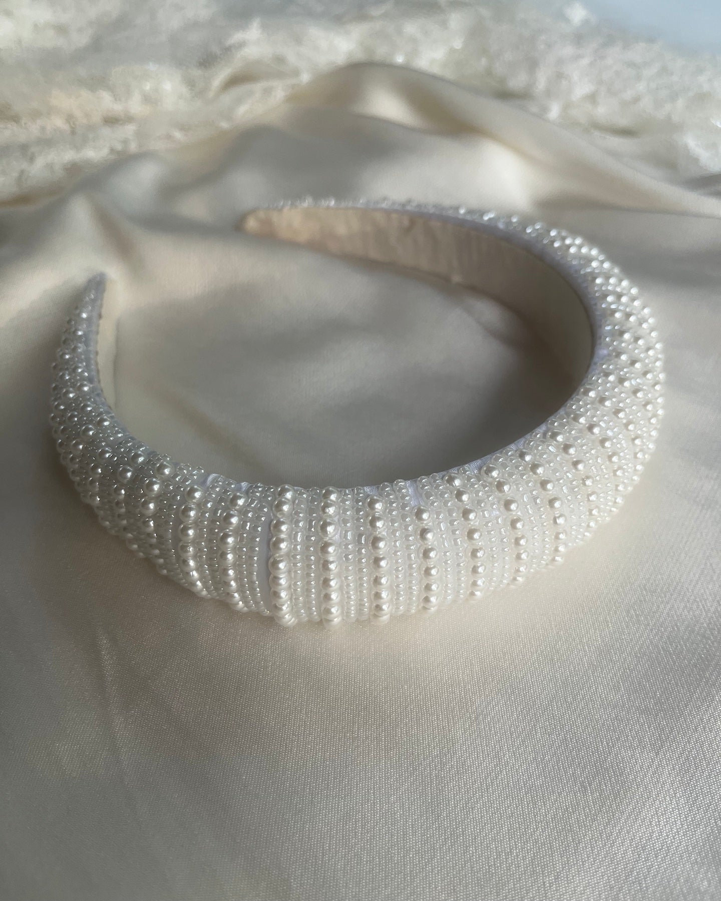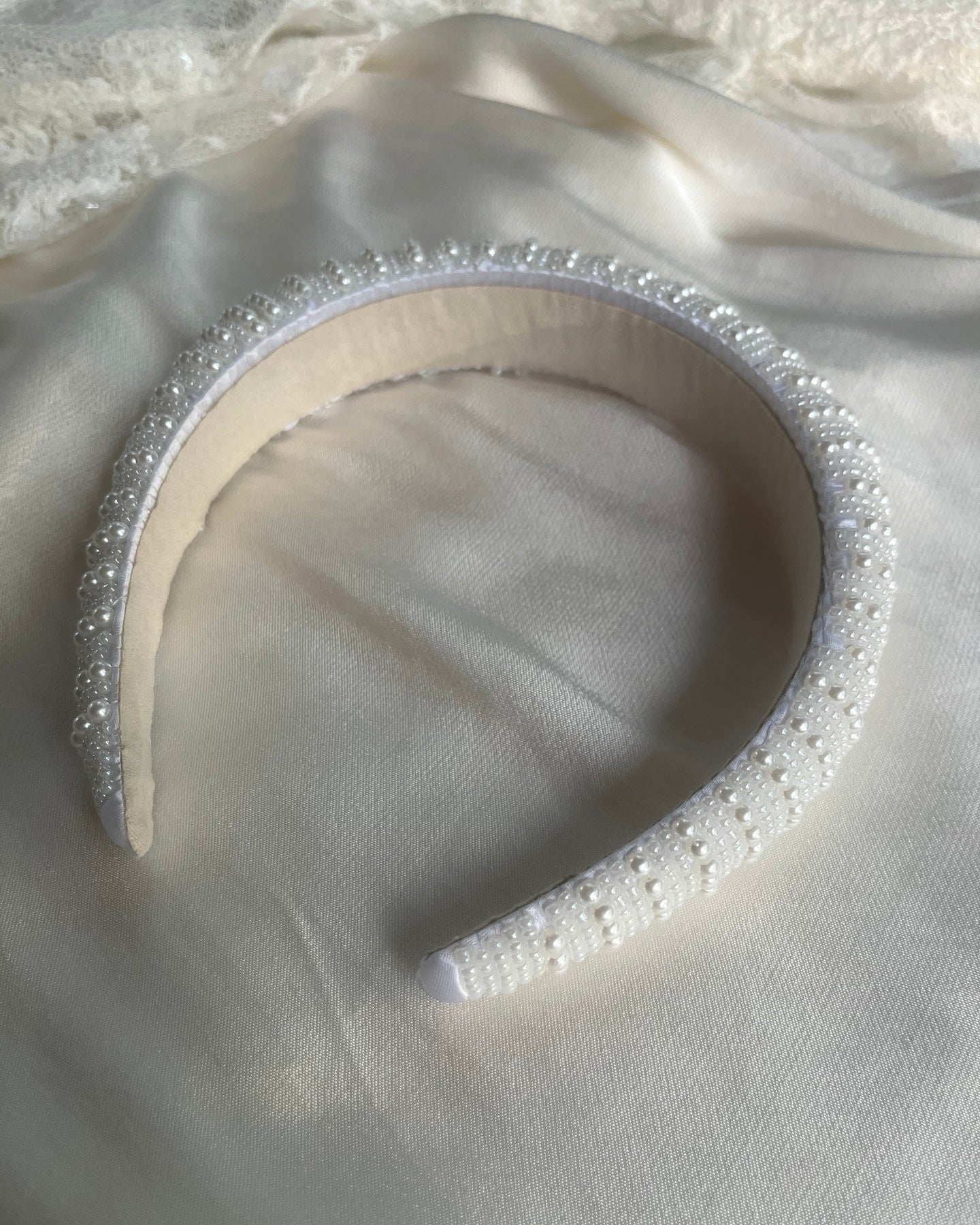 Paksu ja pehmeä hääpanta siroilla helmiriveillä koristeltuna.