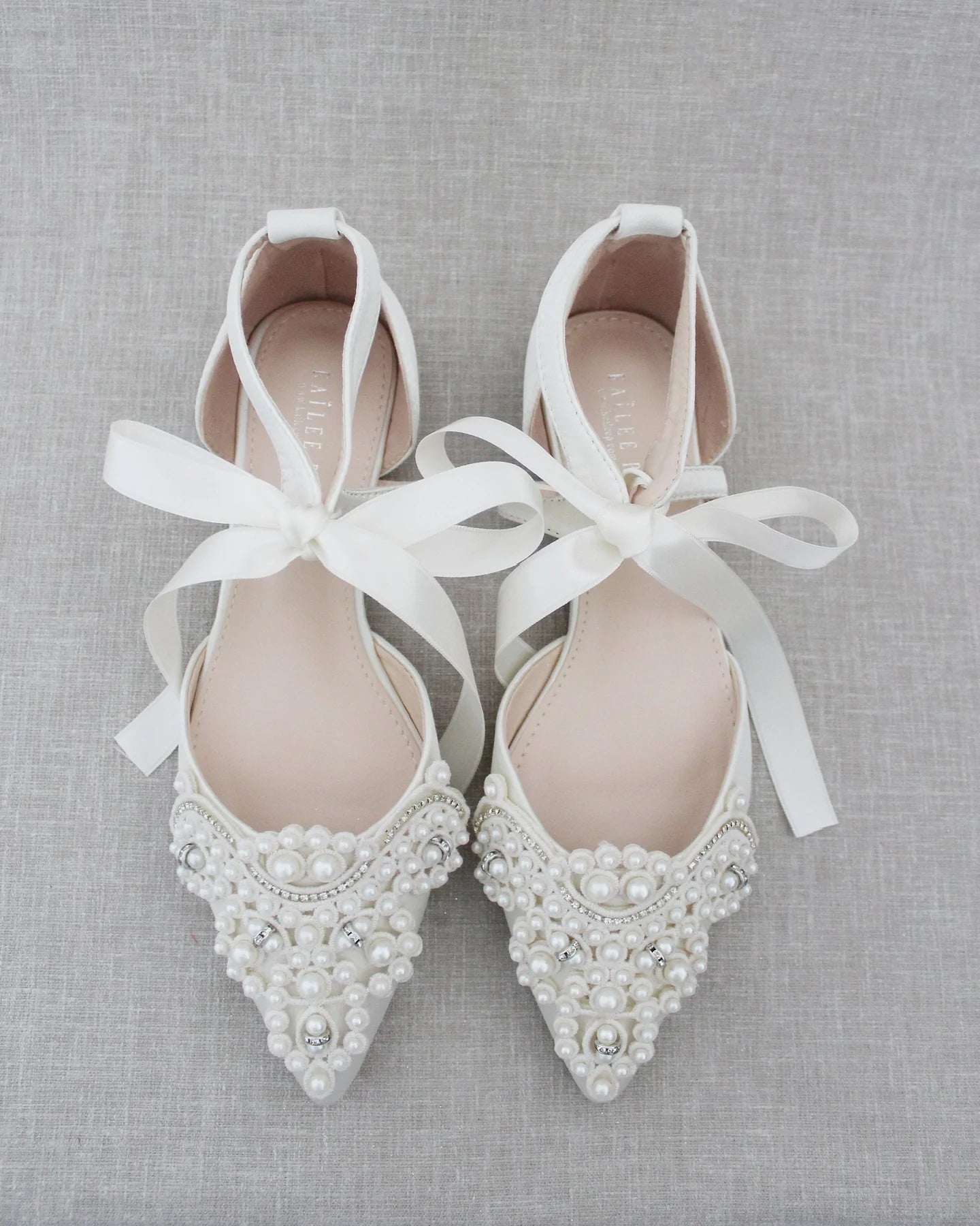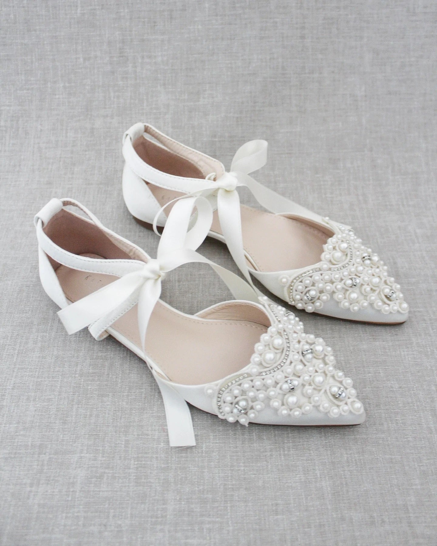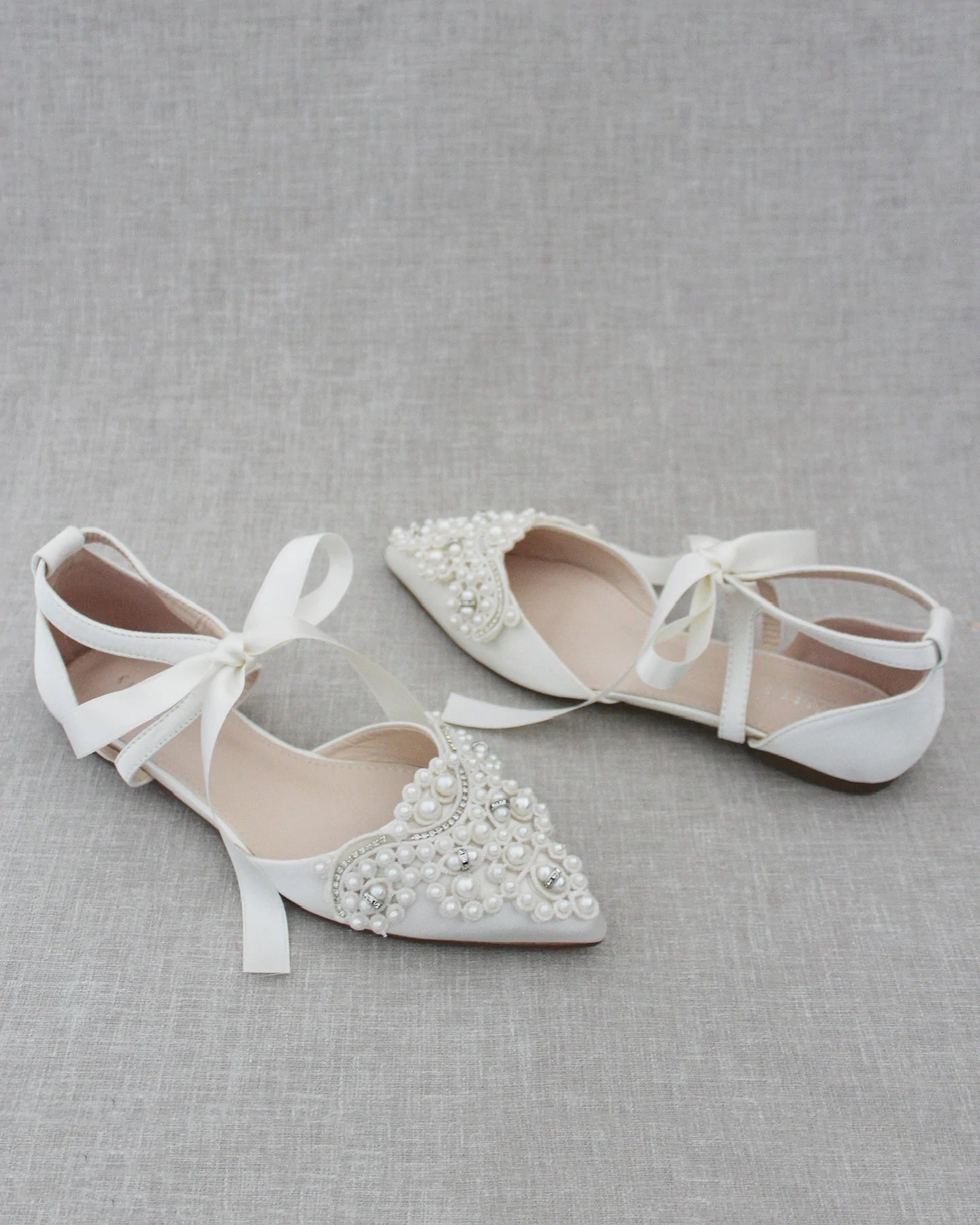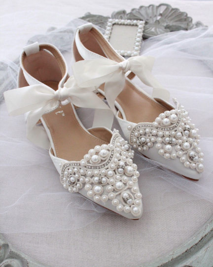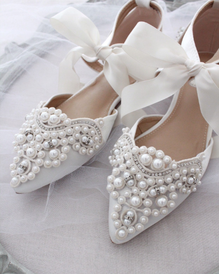 Klassisen tyylikkäät helmikoristellut, teräväkärkiset ja matalakorkoiset juhlakengät tai hääkengät, joiden kanssa voi tanssia auringonlaskuun asti. Kengissä on nilkoissa satiininen nauha. Kengät ovat norsunluun väriset.