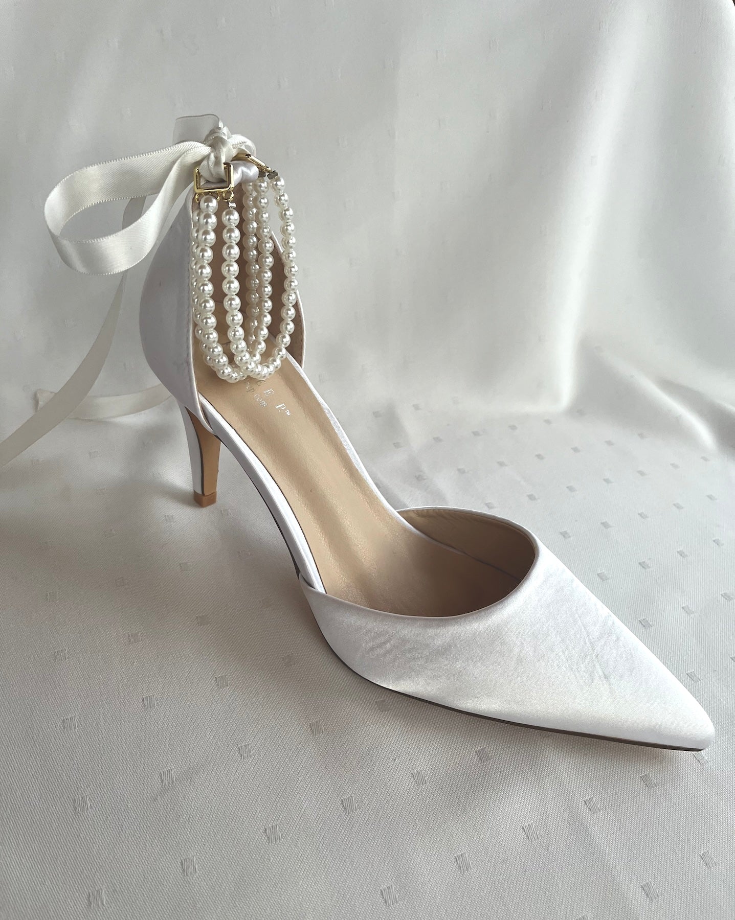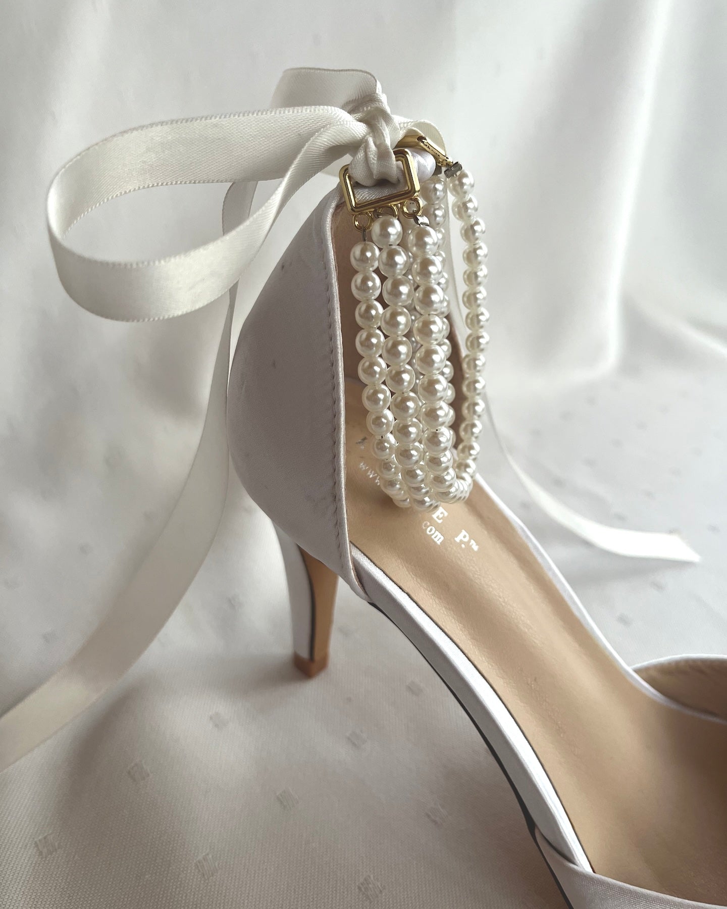 Ylellinen nilkkaremmi kolmella helmirivillä ja sidottavalla silkkinauhalla.