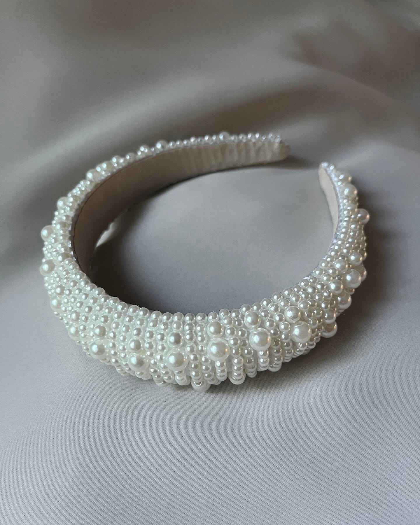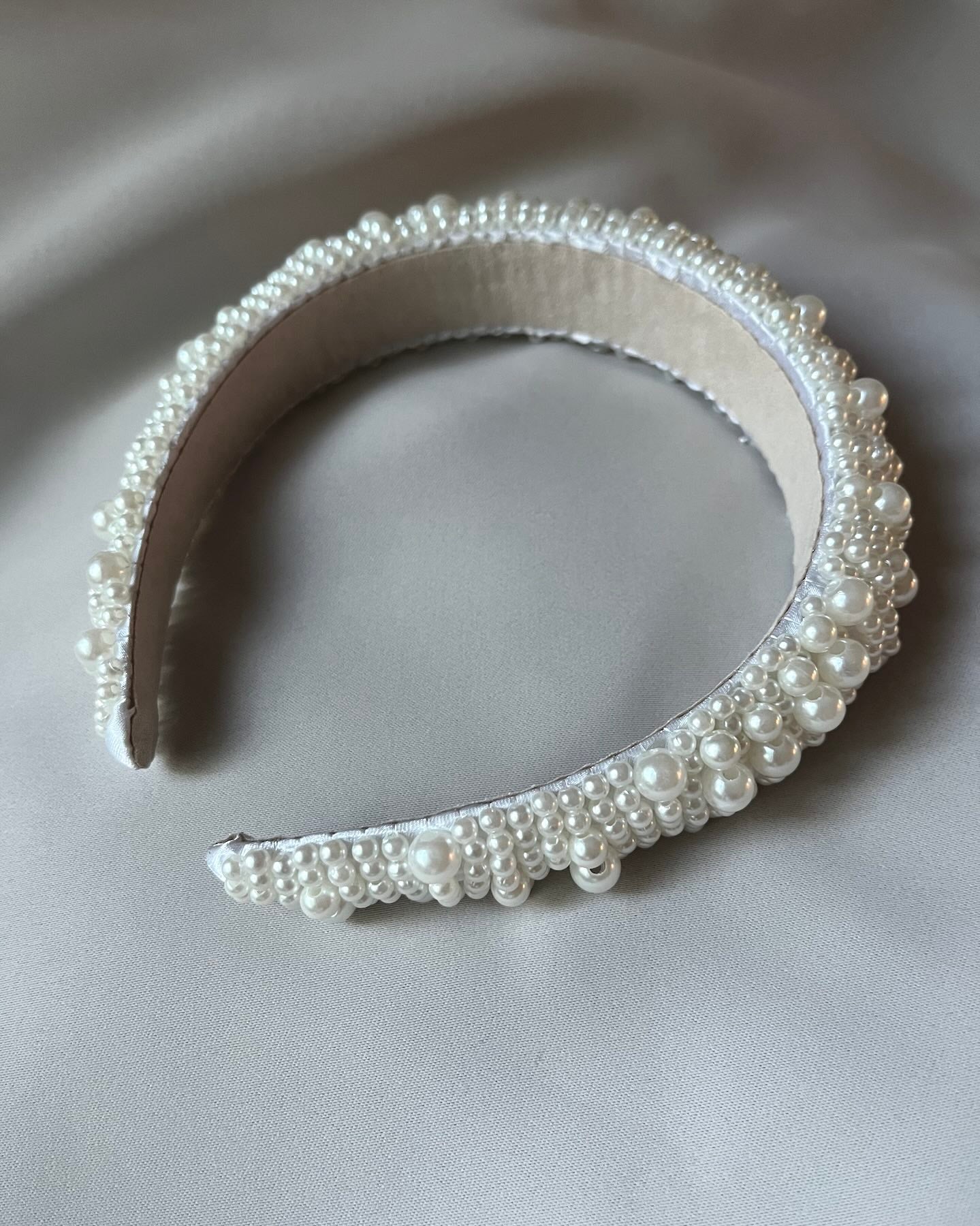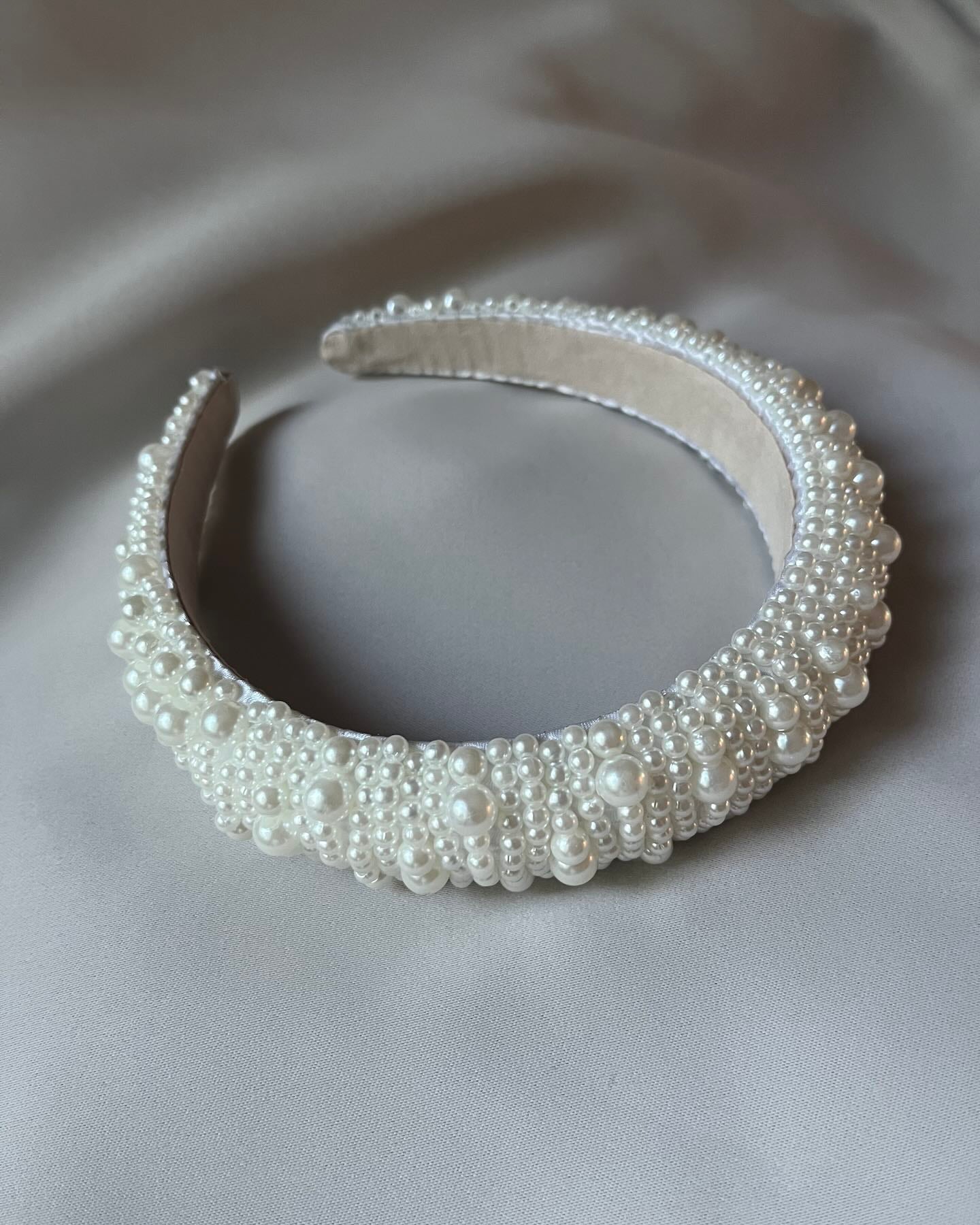 Paksu ja pehmeä hääpanta erikokoisilla helmillä koristeltuna.