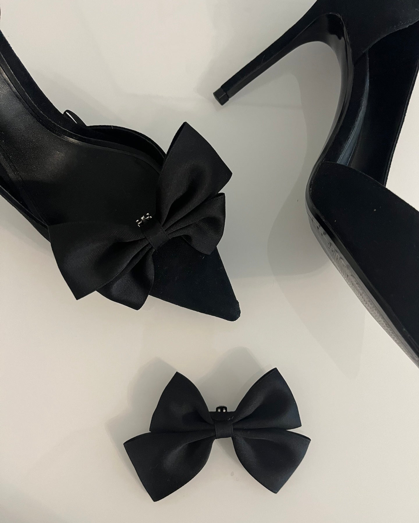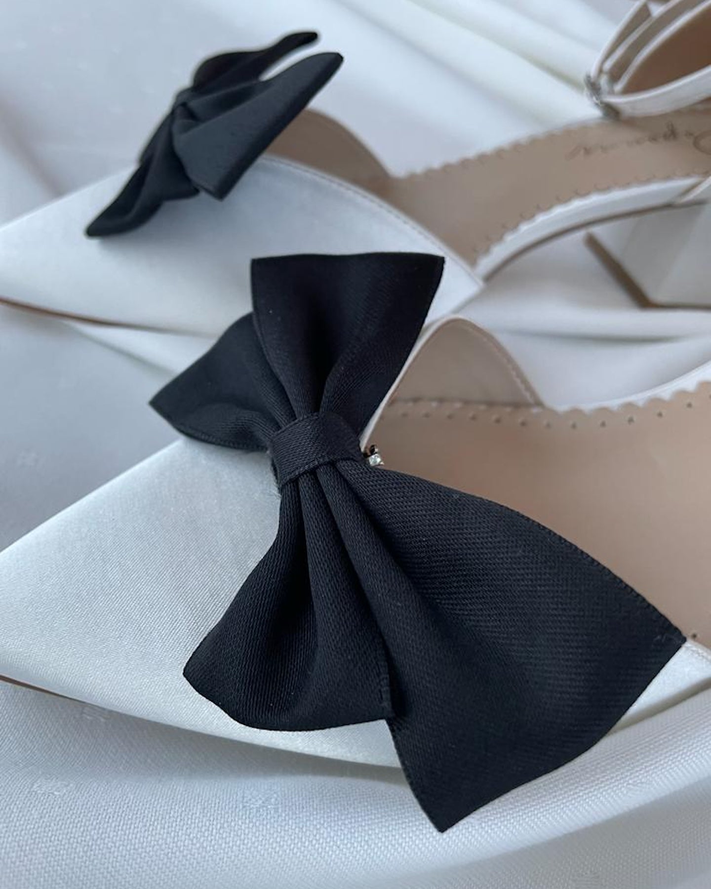 Nämä rusettikenkäkoristeet keräävät eniten ihastusta ja ovat todellinen kestosuosikki! Kätevät kenkäkoristeet kiinnitetään klipsillä, joten voit helposti vaihtaa kenkien tyyliä käden käänteessä. Saatavilla kauniin luonnonvalkoisena ja klassisena mustana. Nämä koristeet ostetaan useimmiten yhdessä Bea- tai Eva-kenkien kanssa.