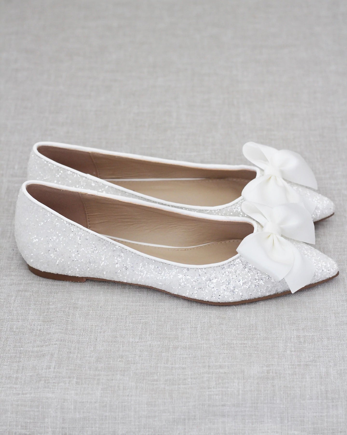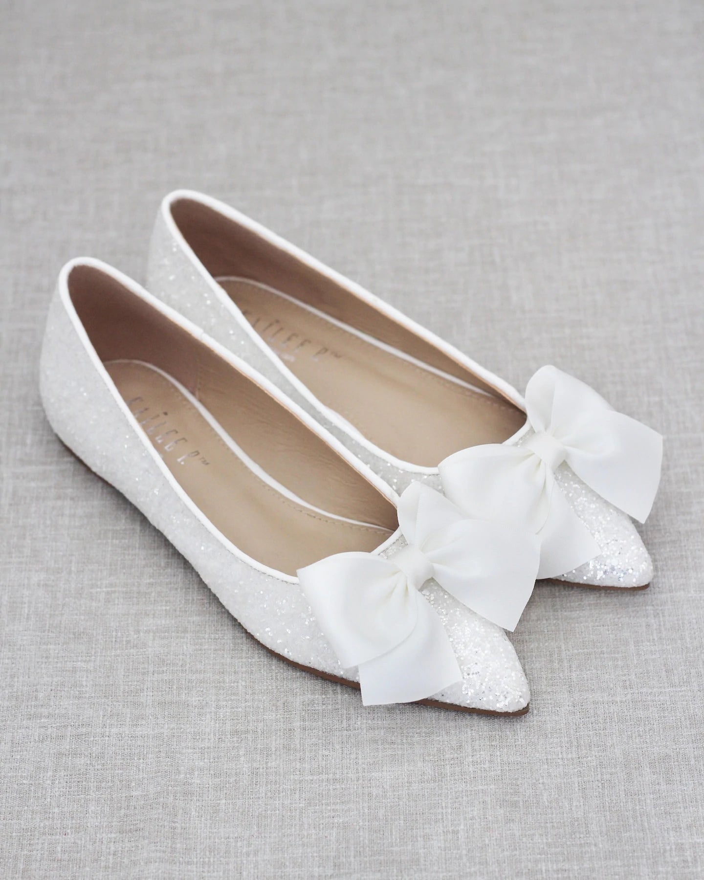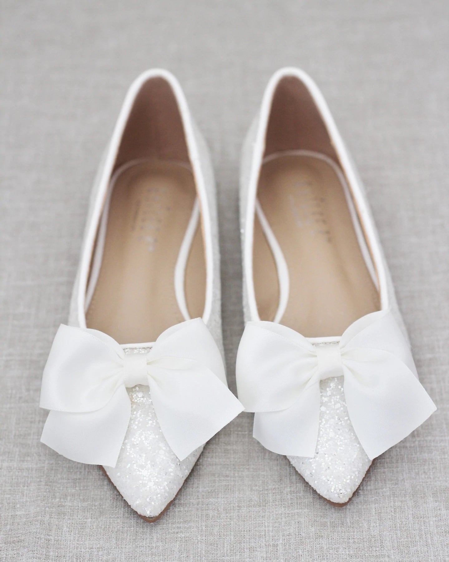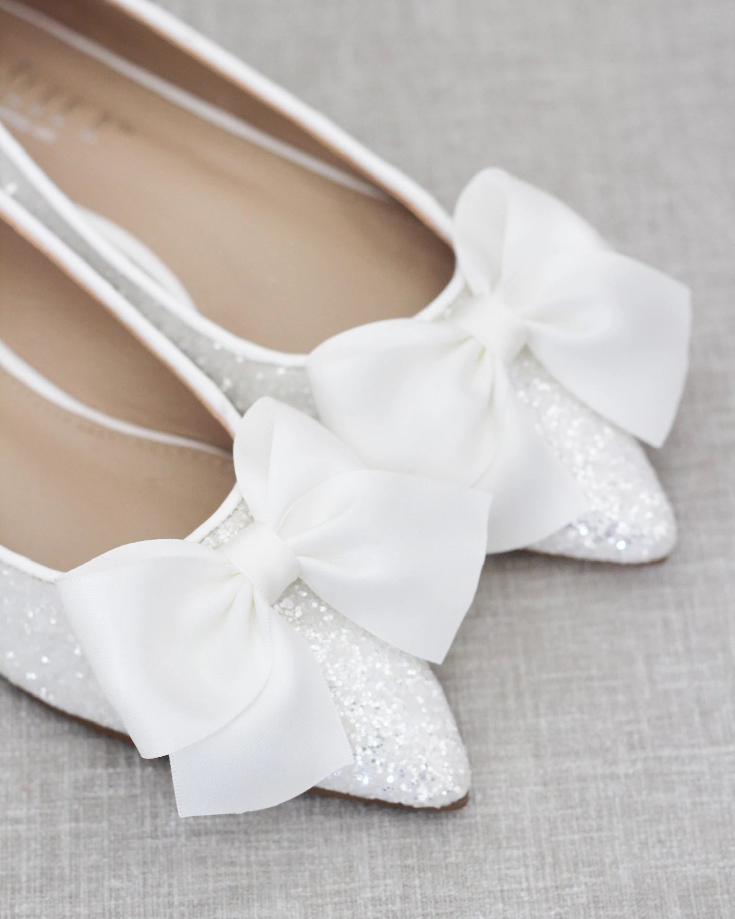 Ihanan kimaltavat teräväkärkiset glitterballerinat, joissa näyttävänä lisänä kaunis satiinirusetti. Miellyttävät matalakorkoiset juhlakengät tai hääkengät - kaikkiin elämän tähtihetkiin. Kengät ovat puhtaan valkoiset.
