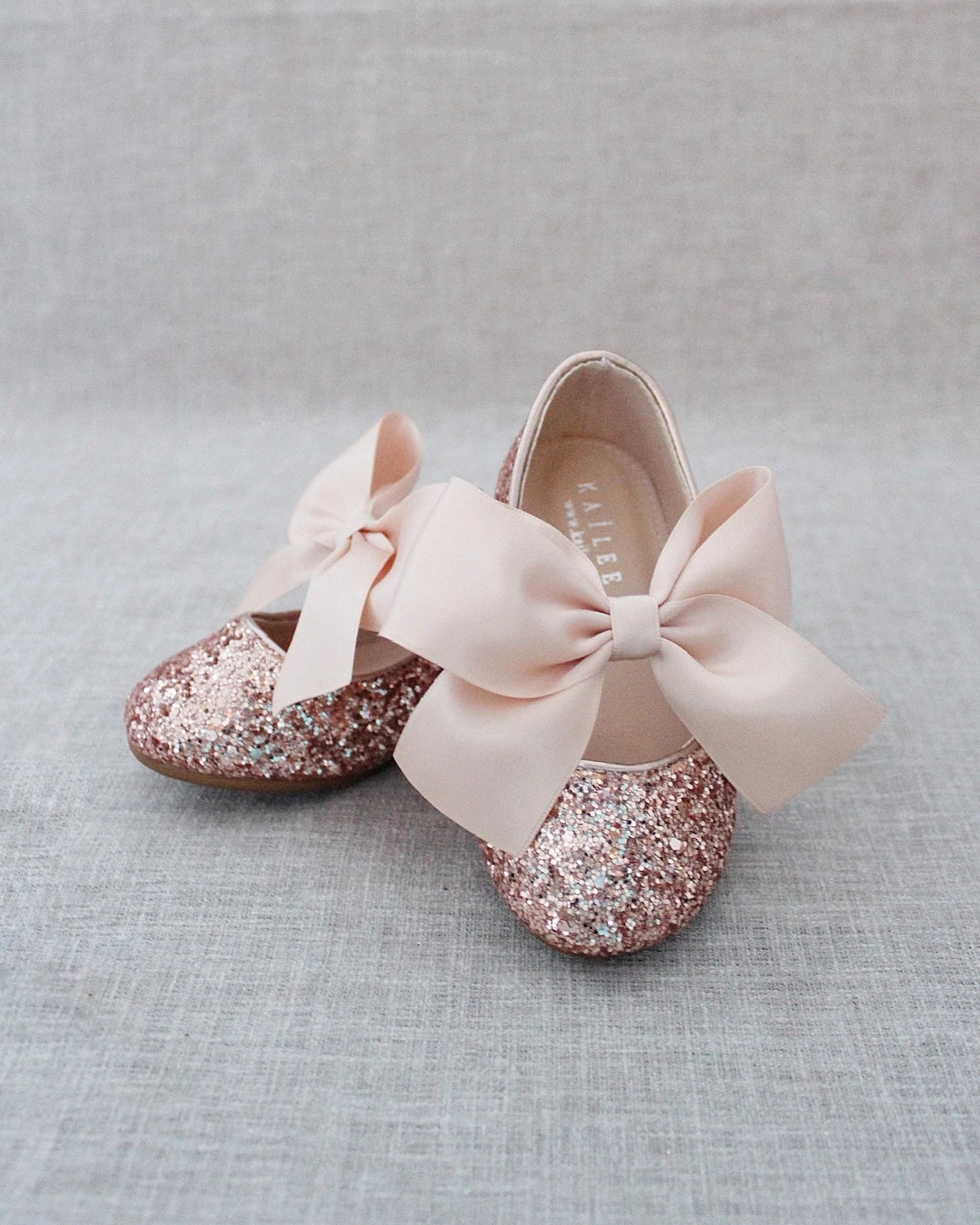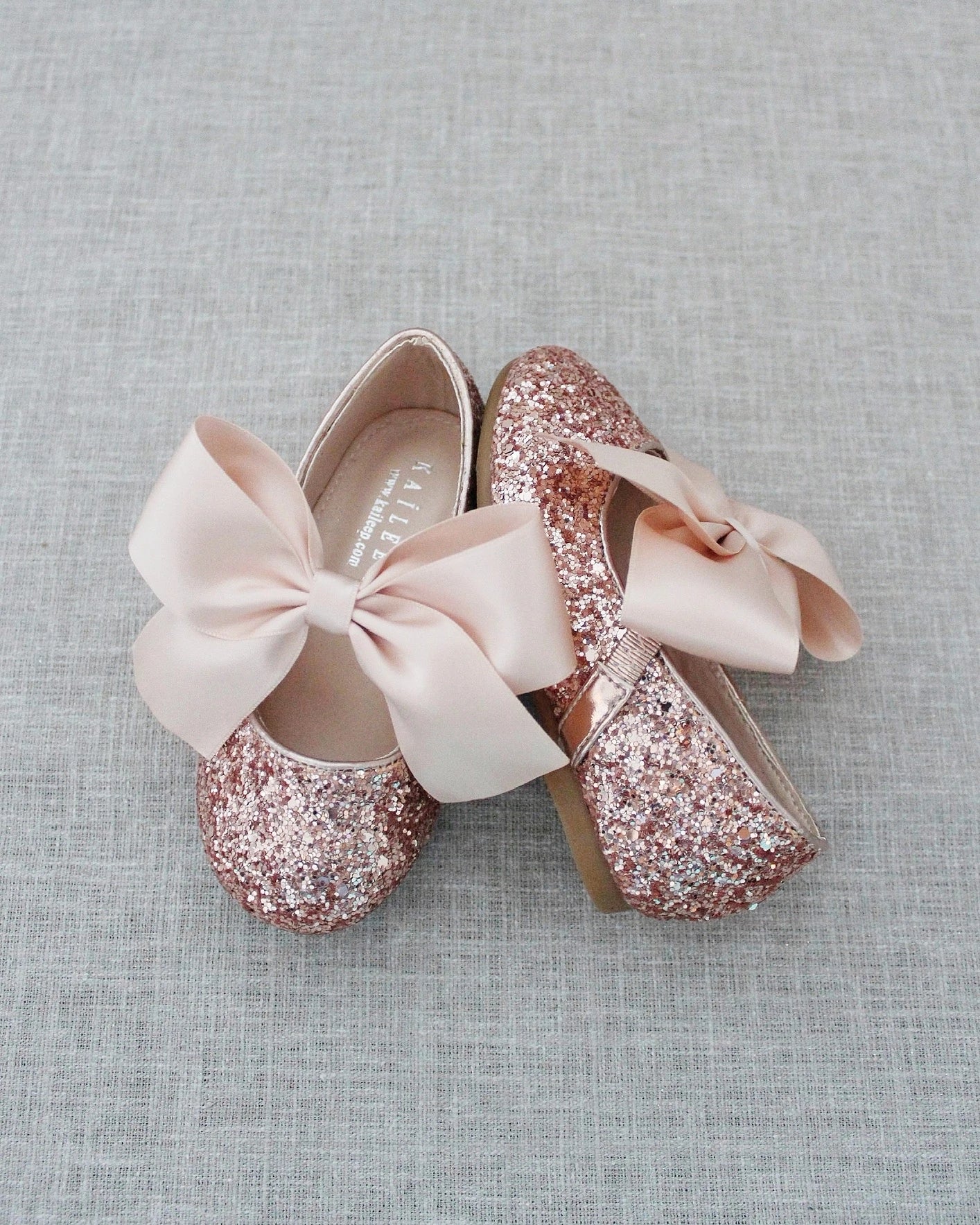 Hurmaavan säihkyvät lasten glitterballerinat, joissa kaunis satiinirusetti. Miellyttävät ja tyylikkäät juhlakengät perheen pienimmille tähtösille. Upeat lasten juhlakengät kukkaistytölle tai syntymäpäiväjuhliin.
