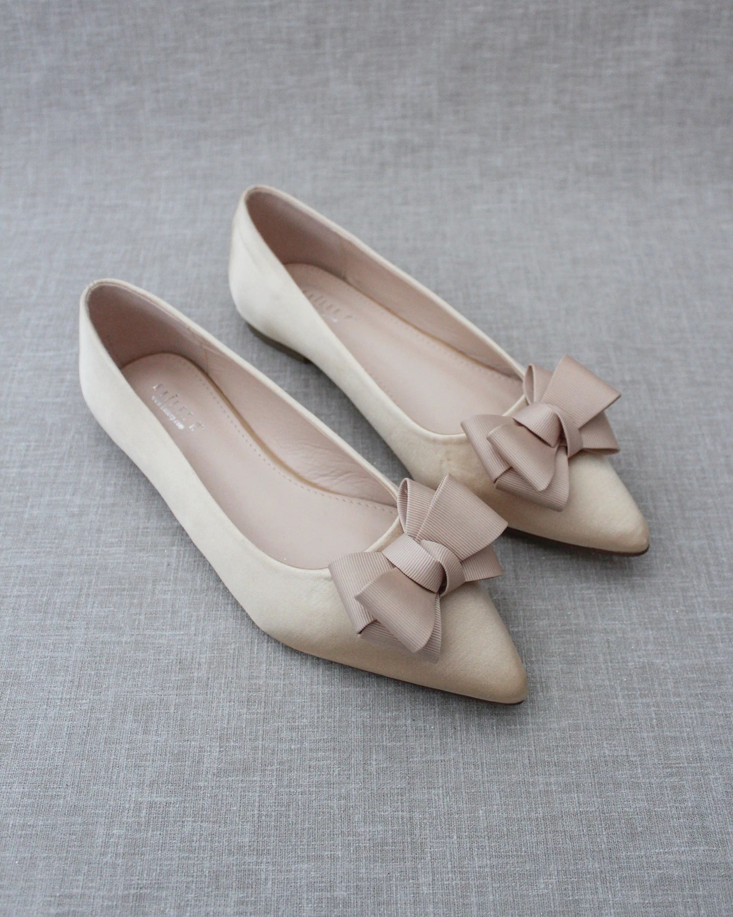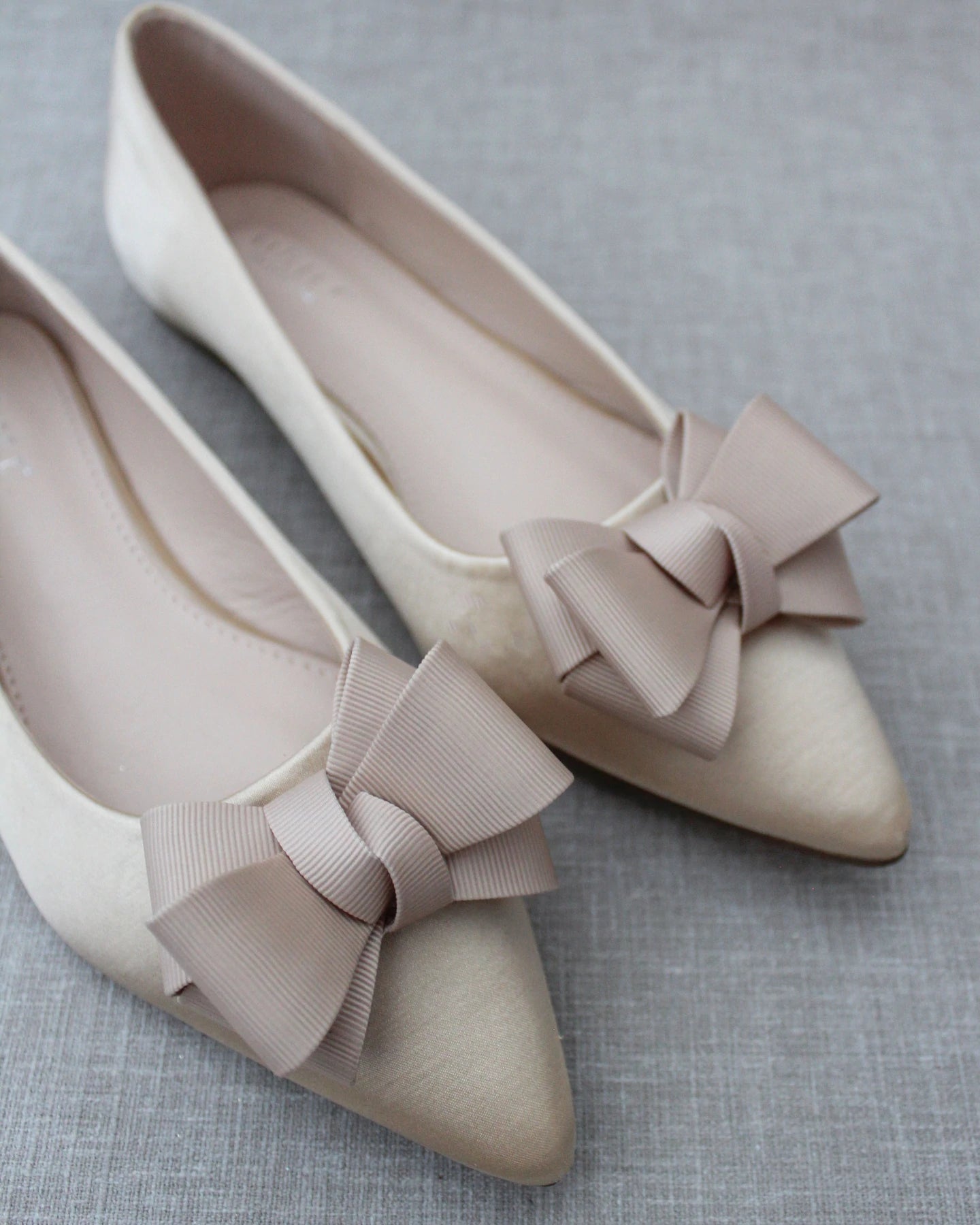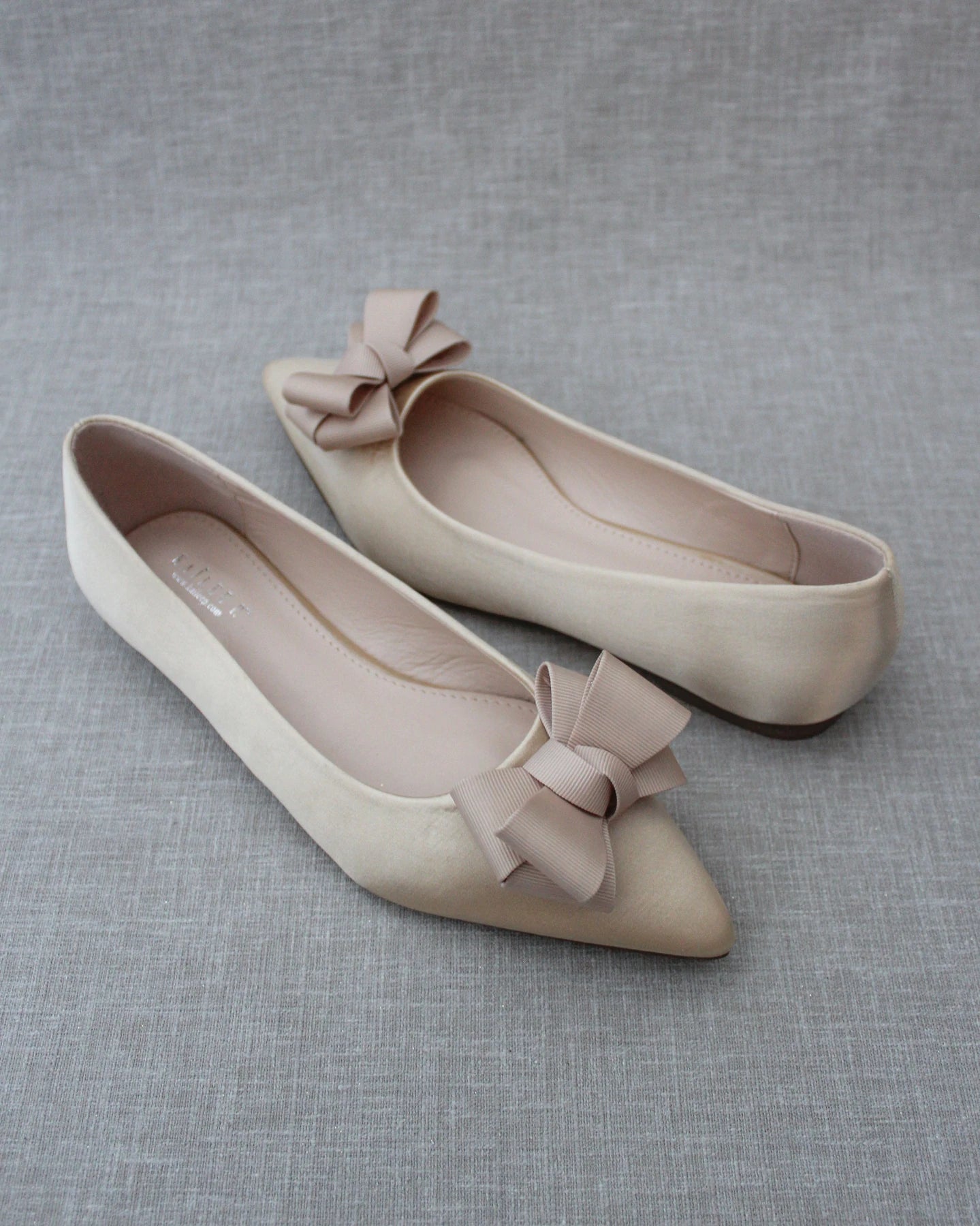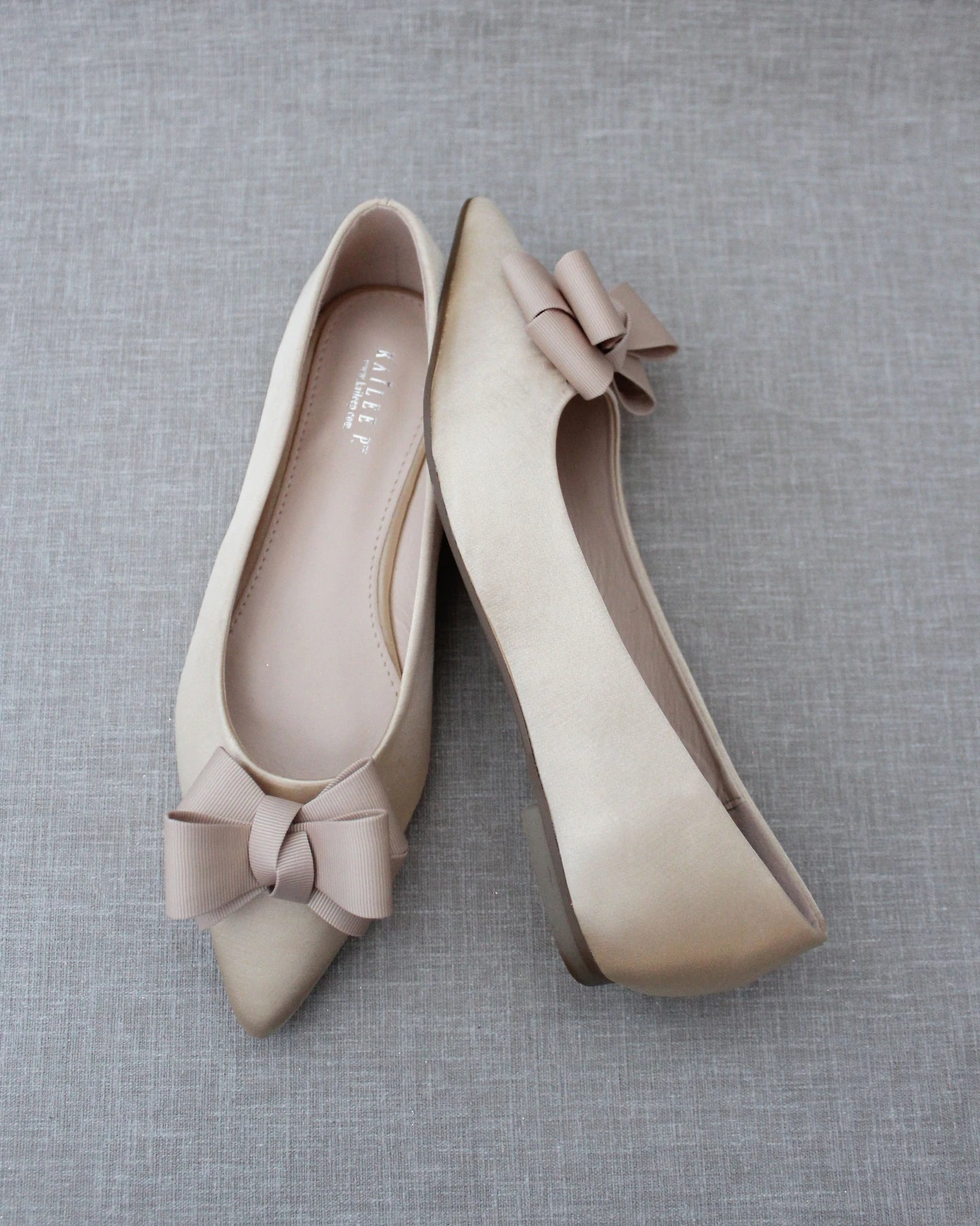 Klassisen tyylikkäät, teräväkärkiset ja matalat juhlakengät hurmaavalla kangasrusetilla. Näyttävät beiget ballerinat sädehtivään juhlaan tai arkeen.