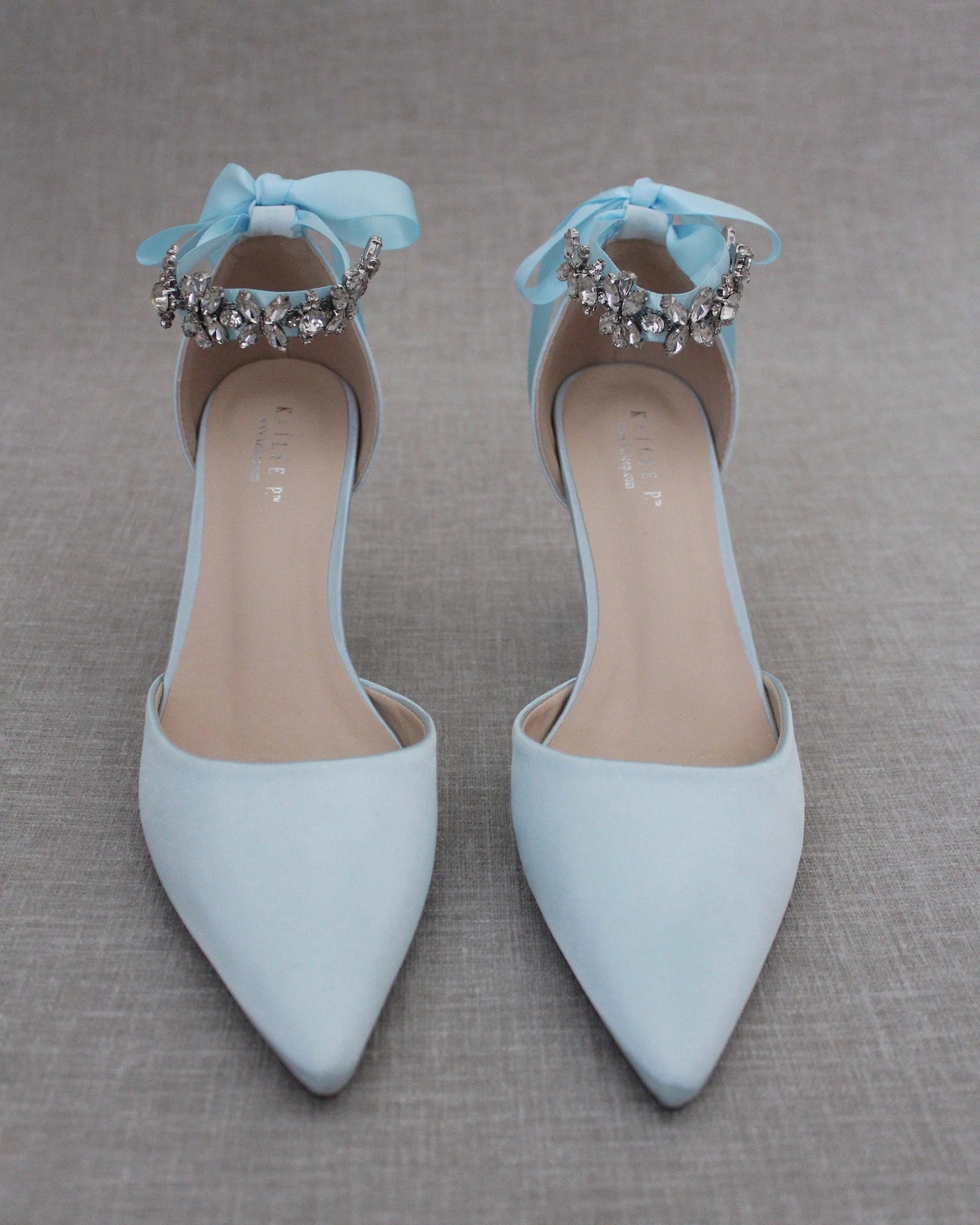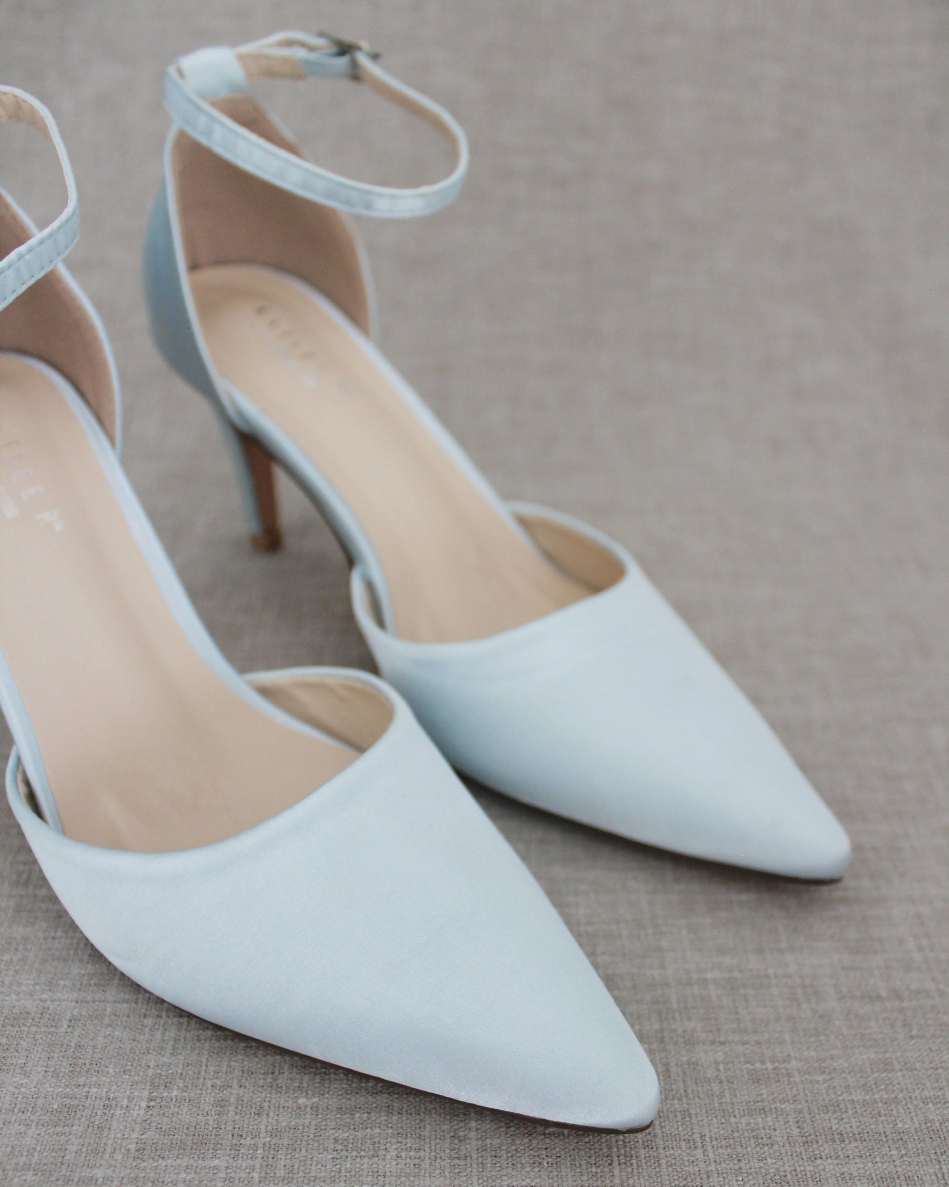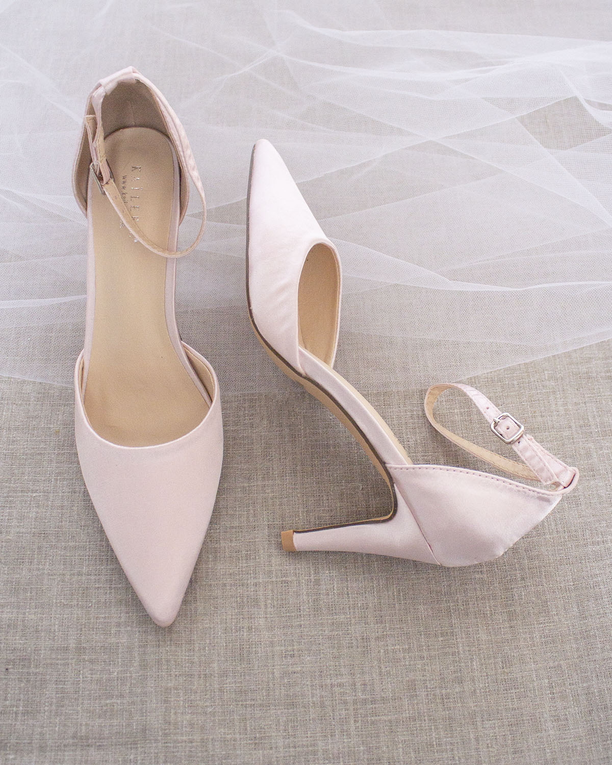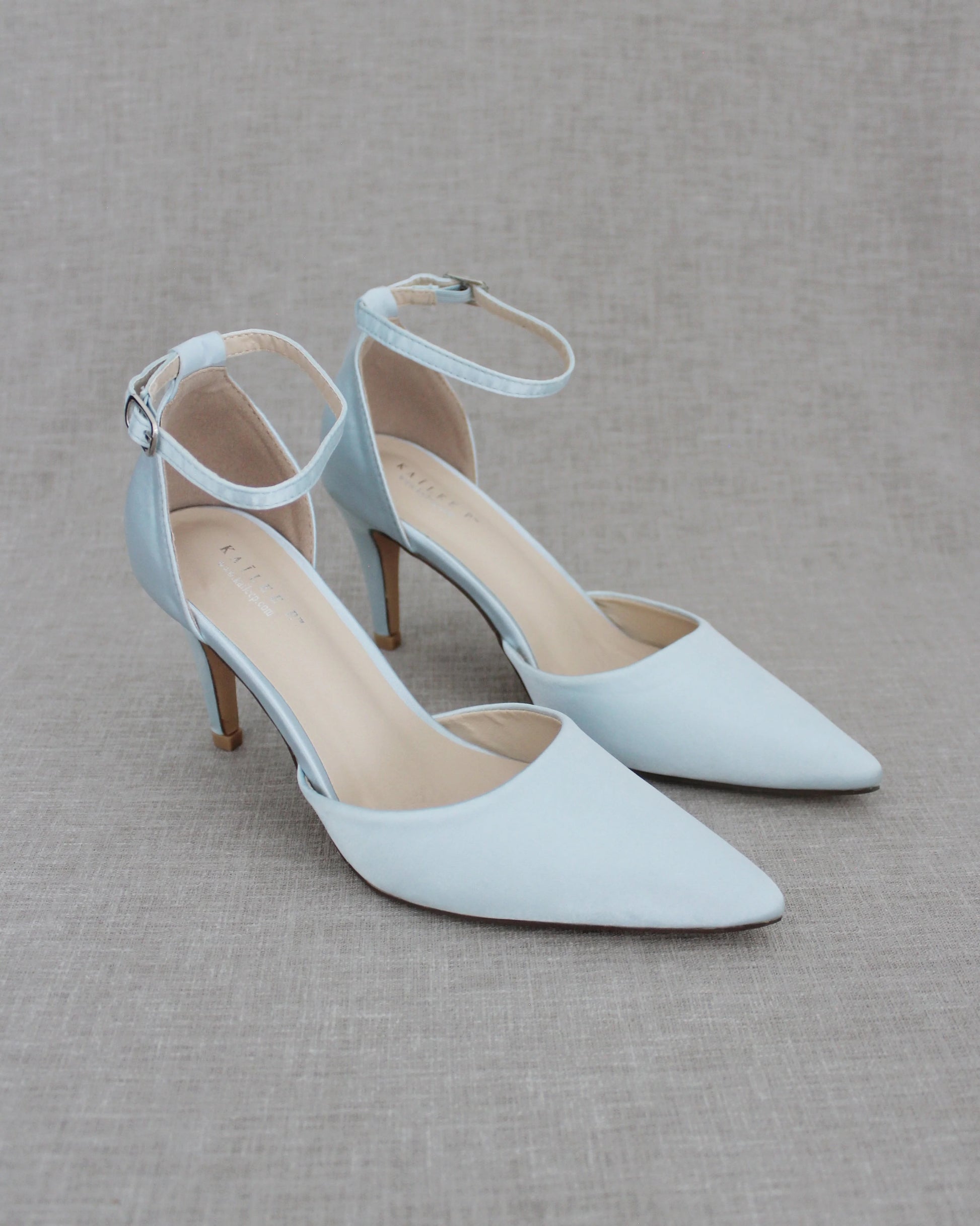 Sirot satiiniset teräväkärkiset korkokengät, joita koristavat strassein kimaltelevat nilkkaremmit. Naisellinen valinta juhlaan kuin juhlaan. Kenkien mukana toimitetaan myös tavallinen nilkkaremmi.
