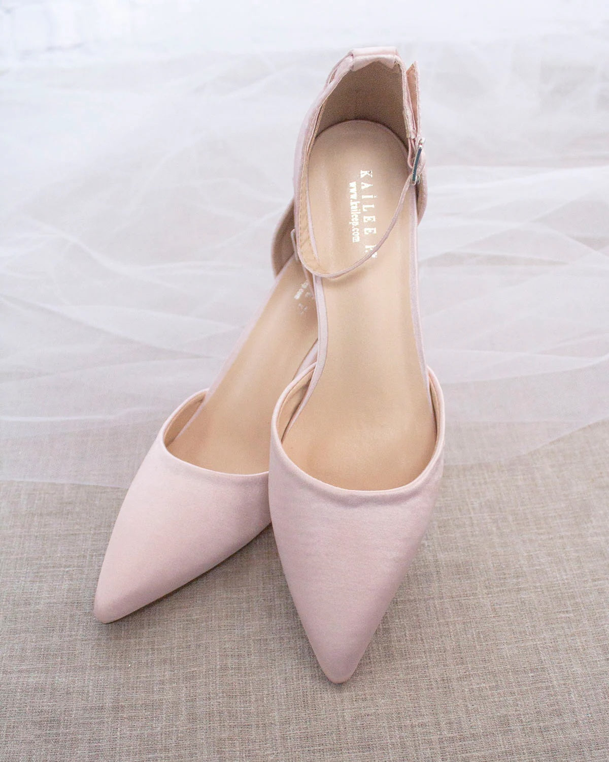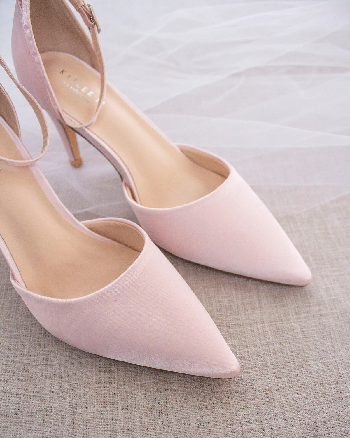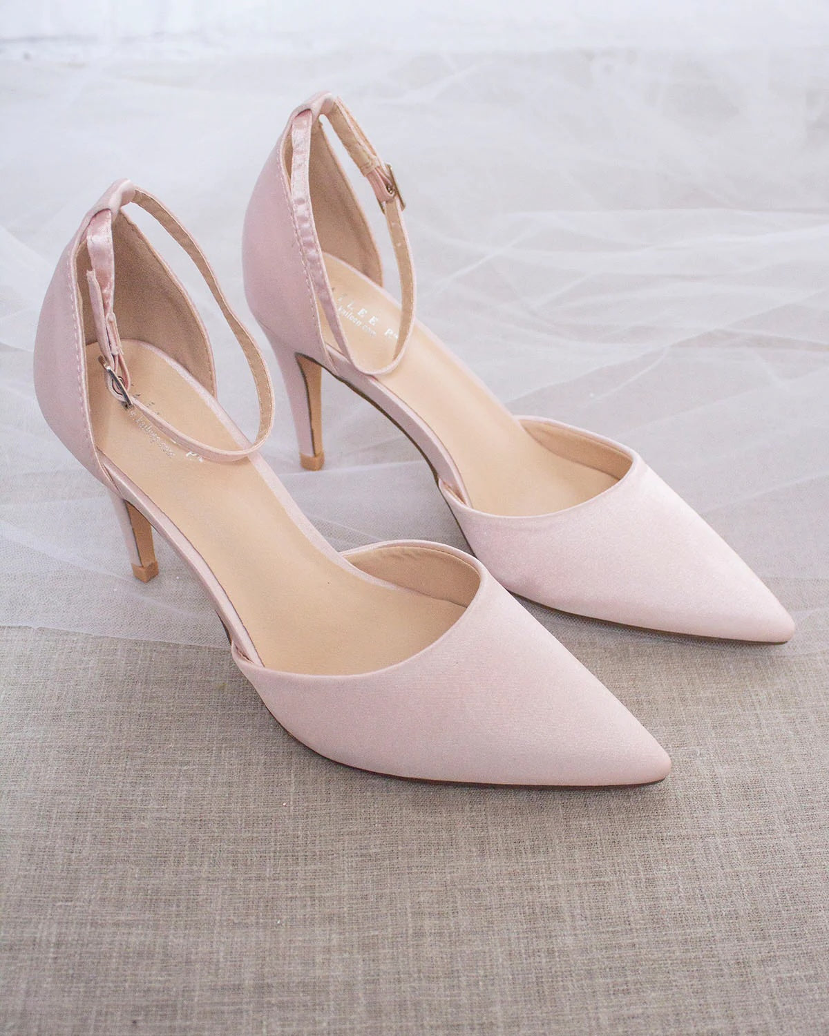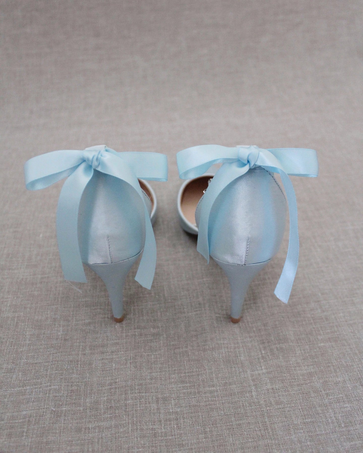 Sirot satiiniset teräväkärkiset korkokengät, joita koristavat strassein kimaltelevat nilkkaremmit. Naisellinen valinta juhlaan kuin juhlaan. Kenkien mukana toimitetaan myös tavallinen nilkkaremmi.
