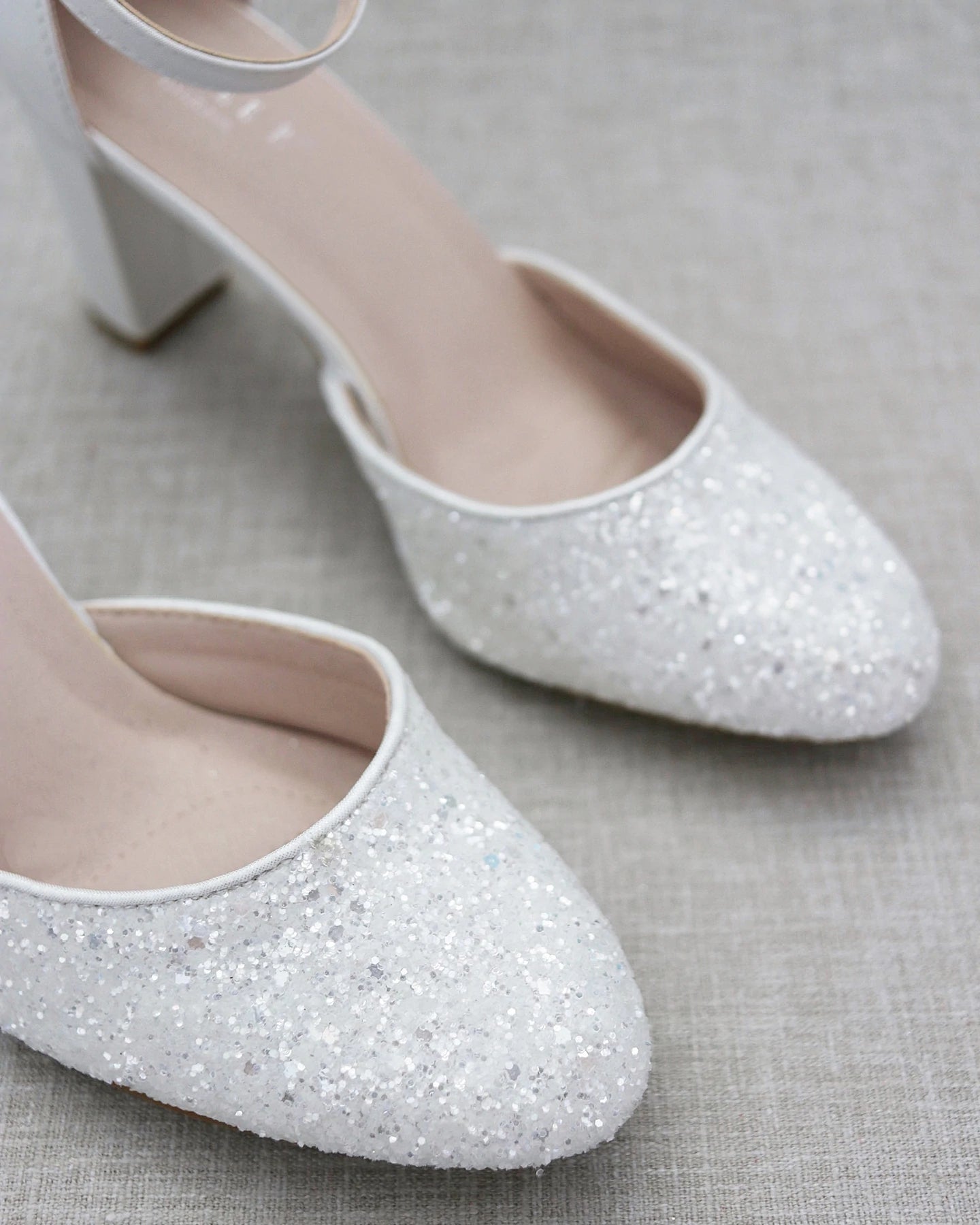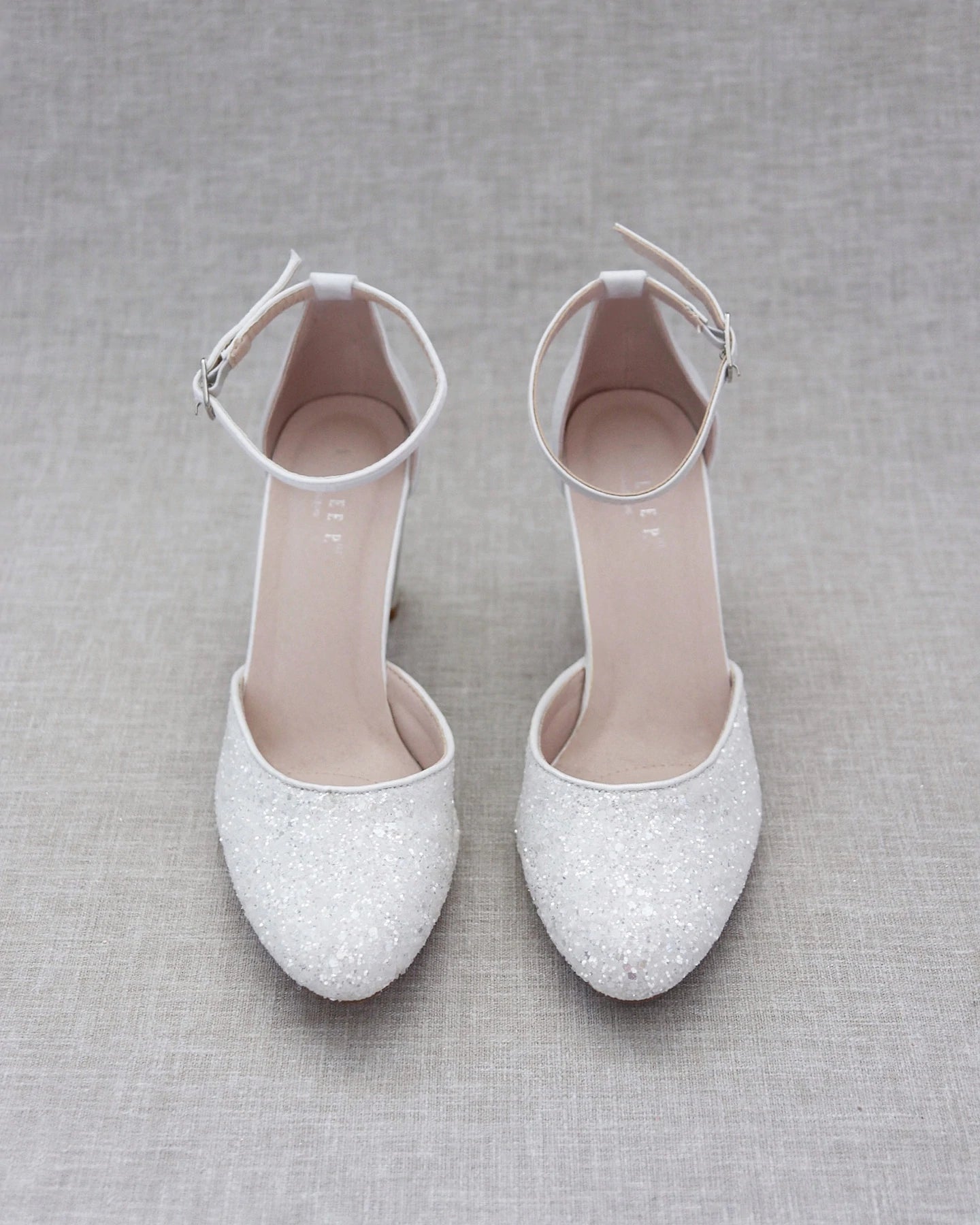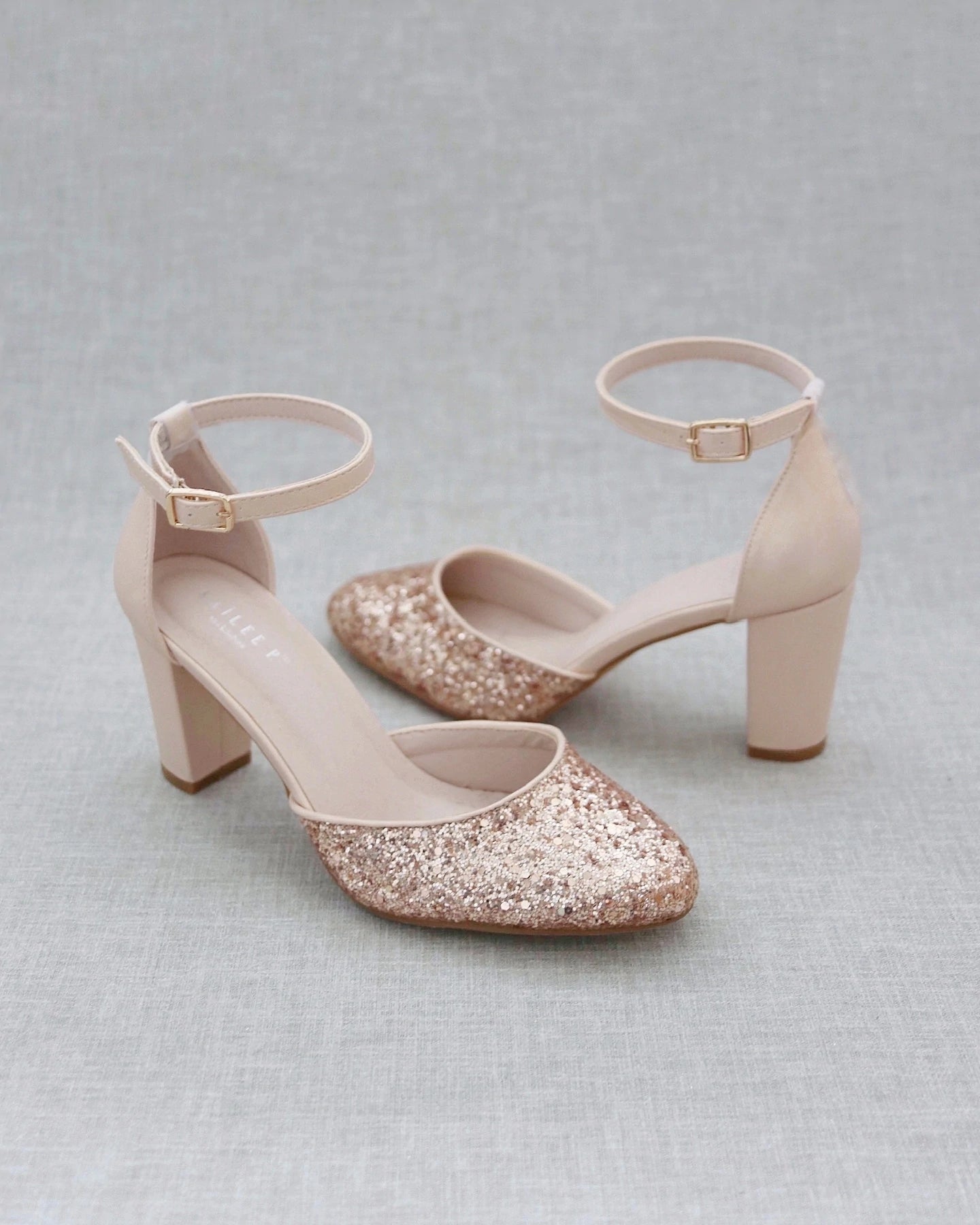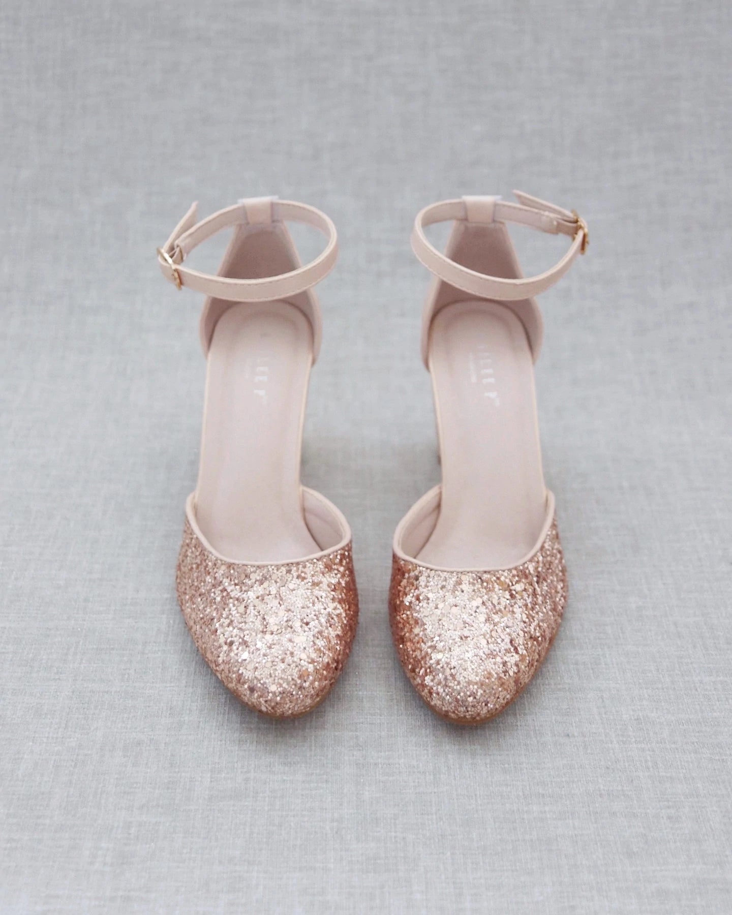 Ihanan kimaltavat ruusukultaiset tai valkoiset korkokengät tukevalla tolppakorolla. Säihkyvät juhlakengät tai hääkengät kaikkiin elämän tähtihetkiin.