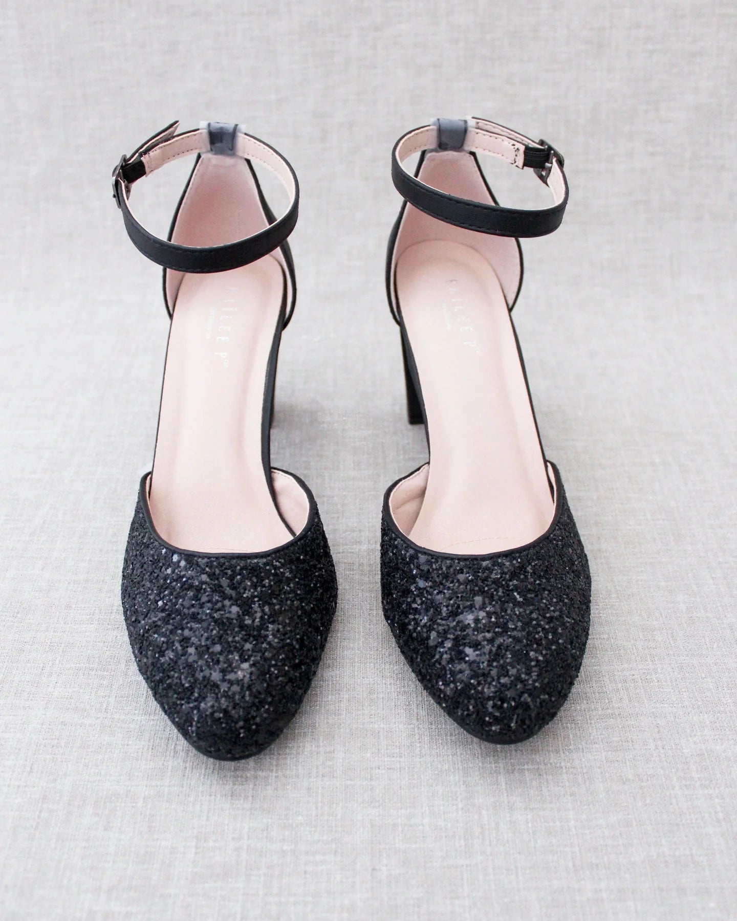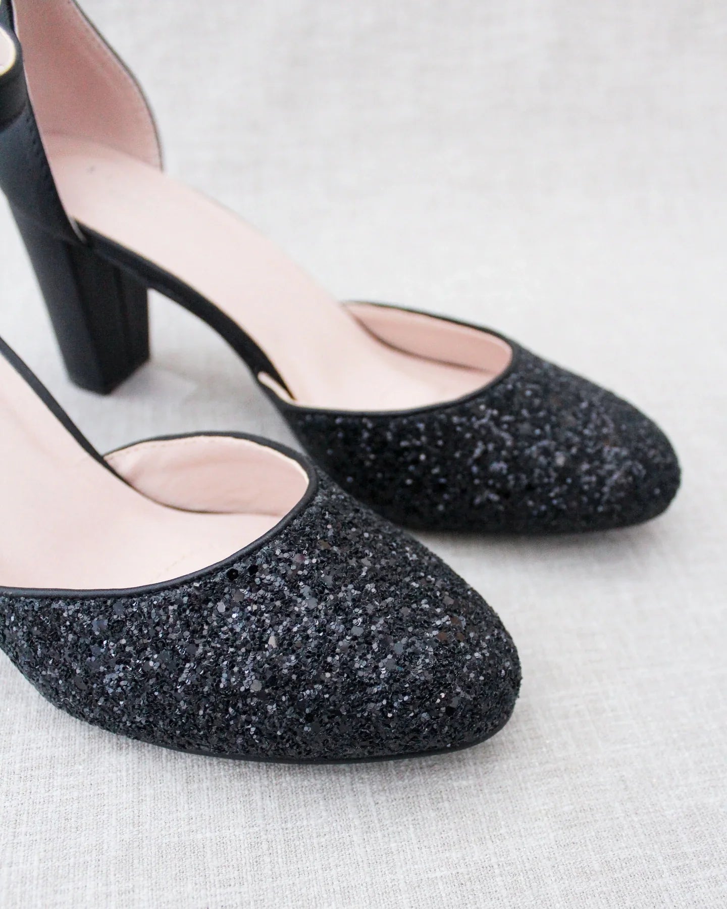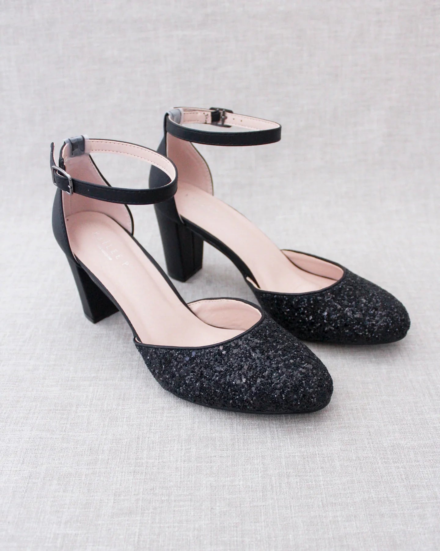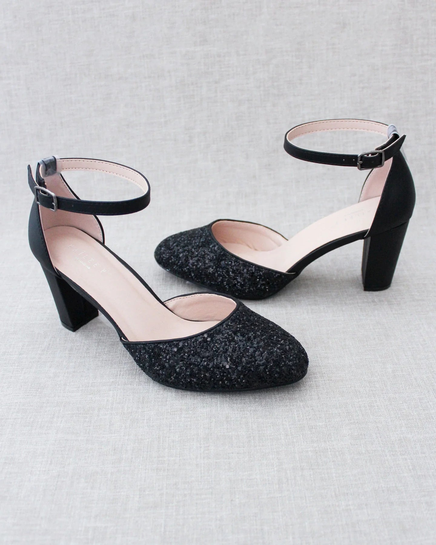 Tyylikkäät juhlakengät mustaa glitteriä tukevalla tolppakorolla ja nilkkaremmillä. Päkiän alla pehmuste. Säihkyvät juhlakengät talven tähtihetkiin!