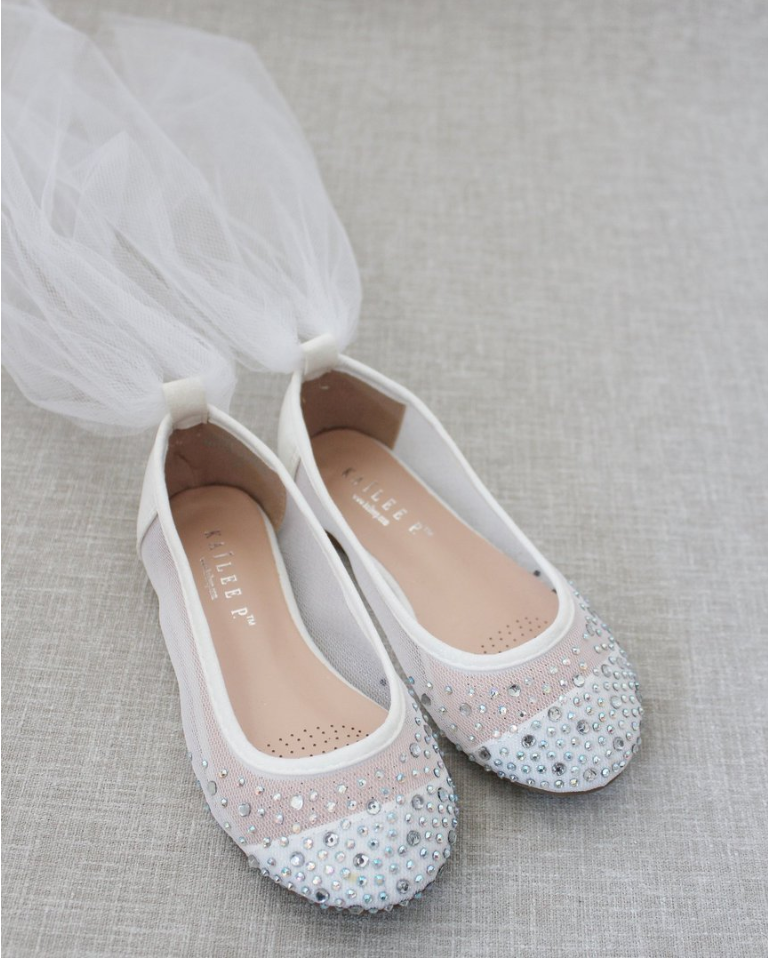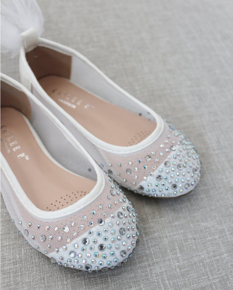 Suloiset ja sirot koristekivillä kruunatut pienen tytön ballerinat. Nilkkaremminä kaunis tyllirusetti, joka tuo keveyttä ja pehmeyttä tähän säkenöivään prinsessan juhlakenkään.