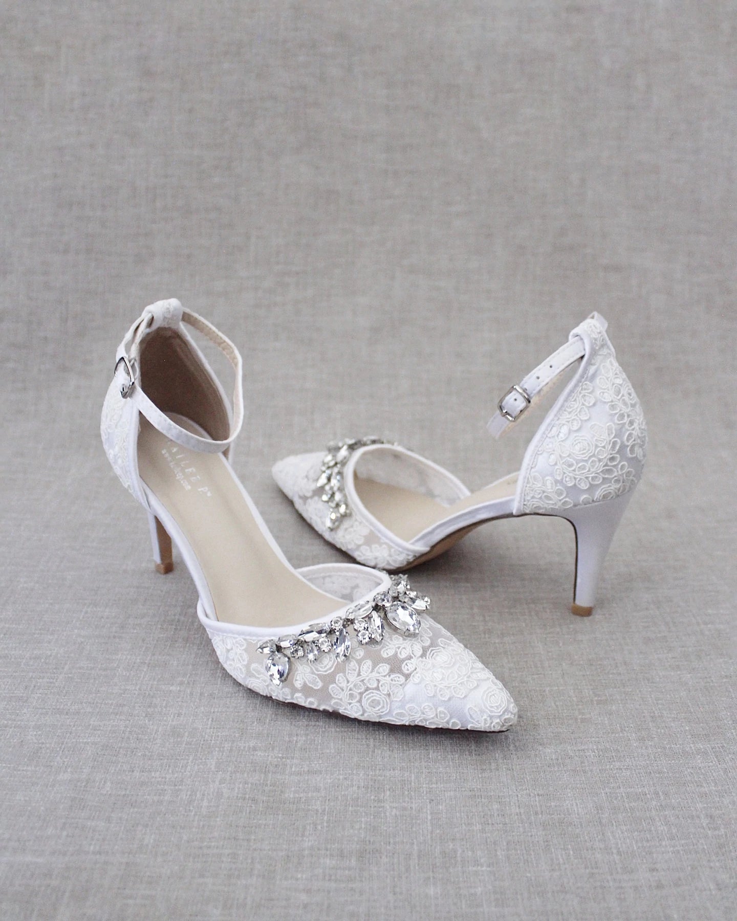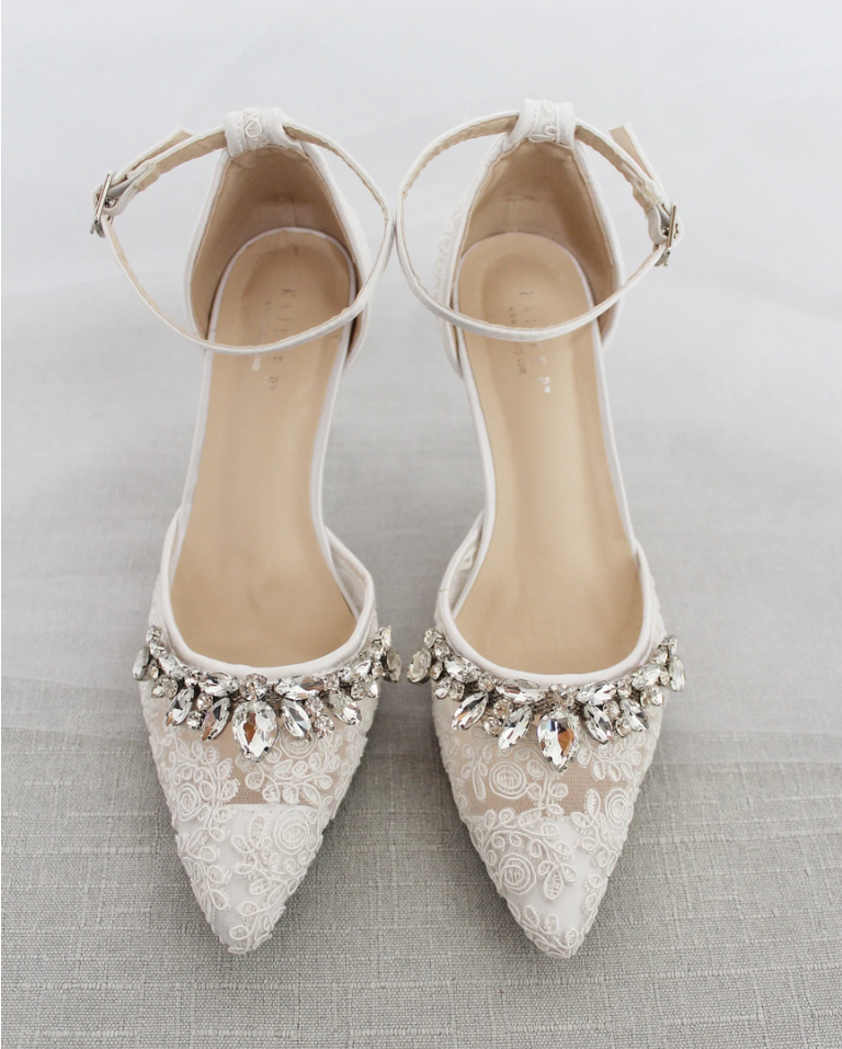 Hienostuneen herkällä pitsillä ja koristekivillä koristellut teräväkärkiset korkokengät tai hääkengät kaikkiin elämäsi tähtihetkiin.