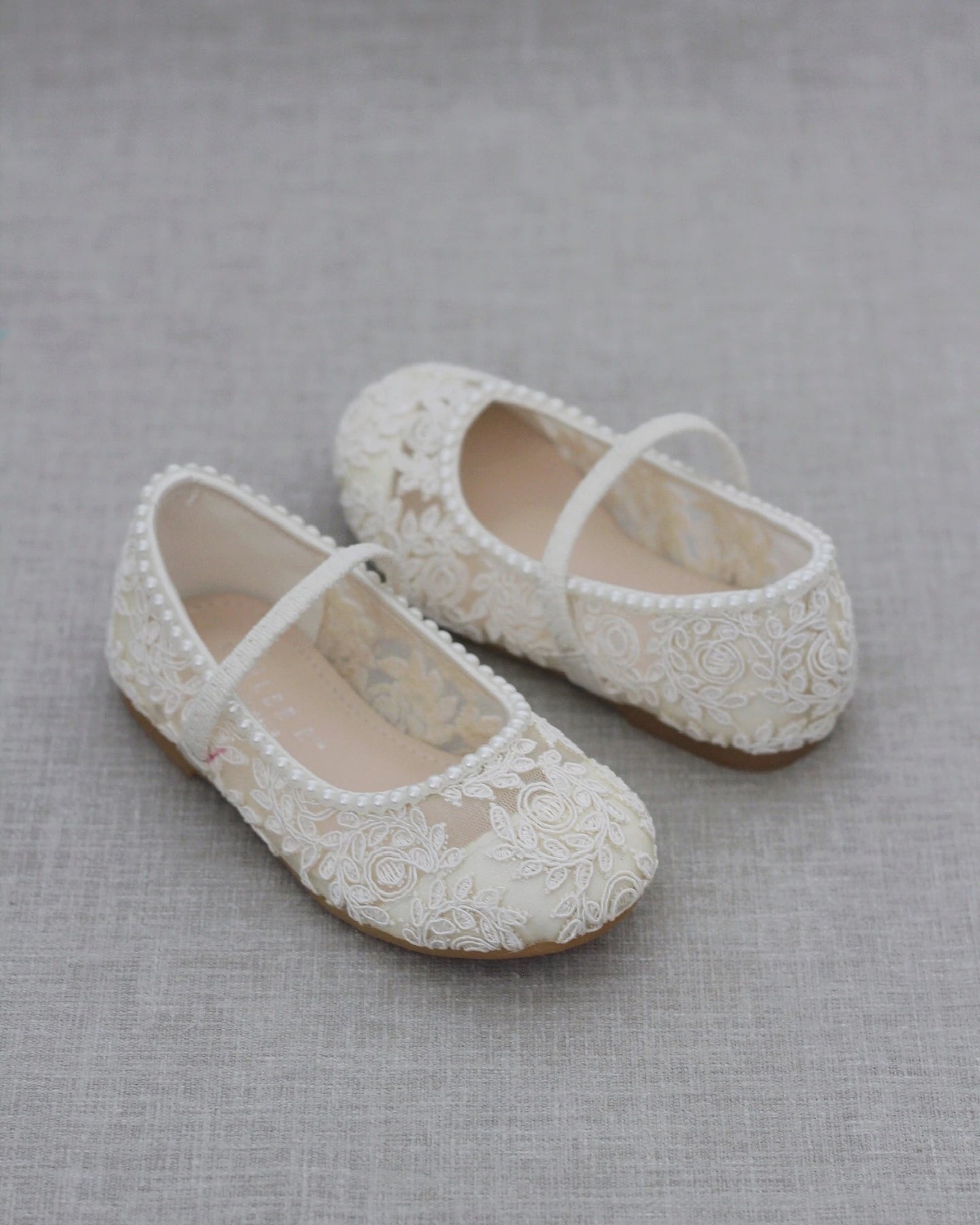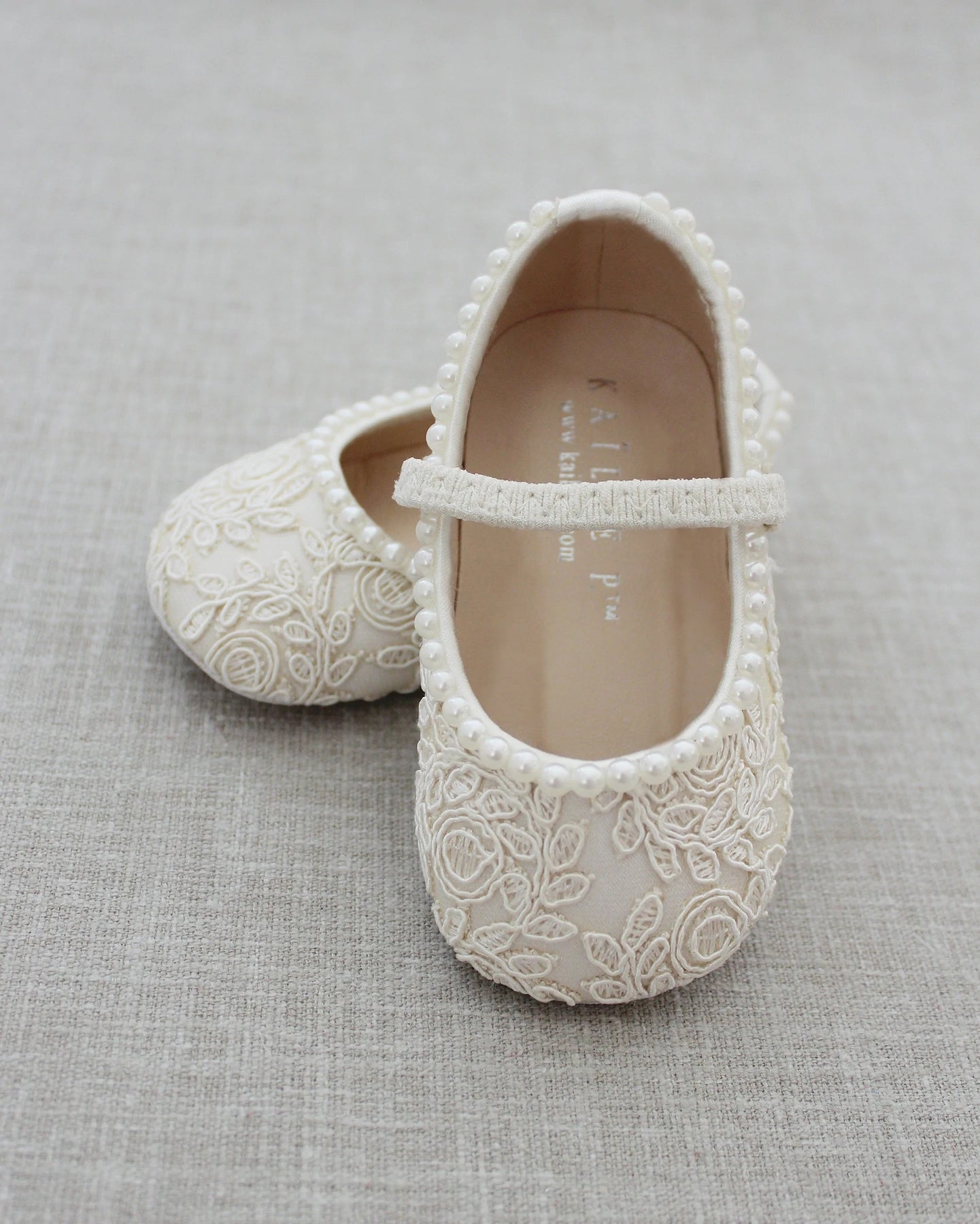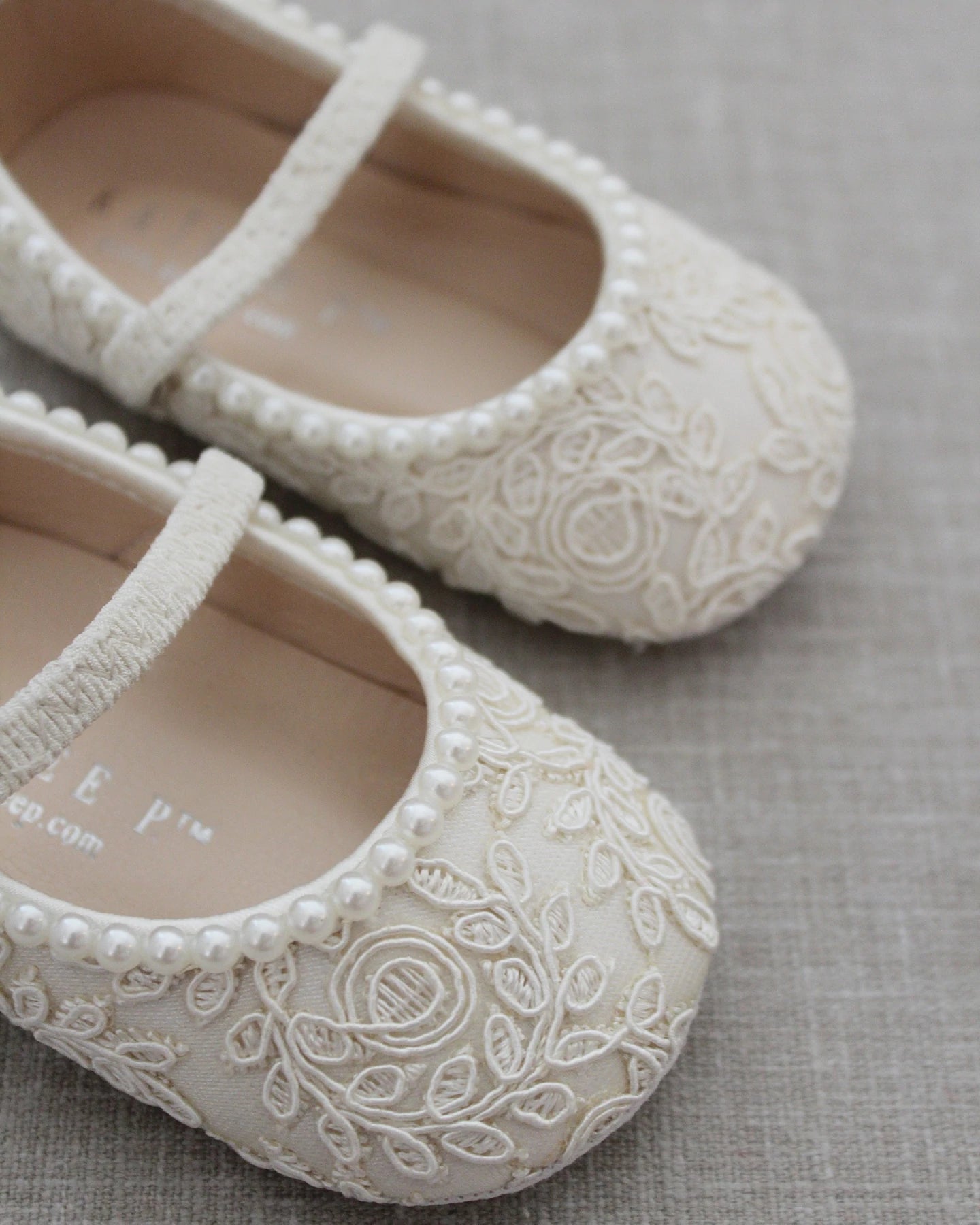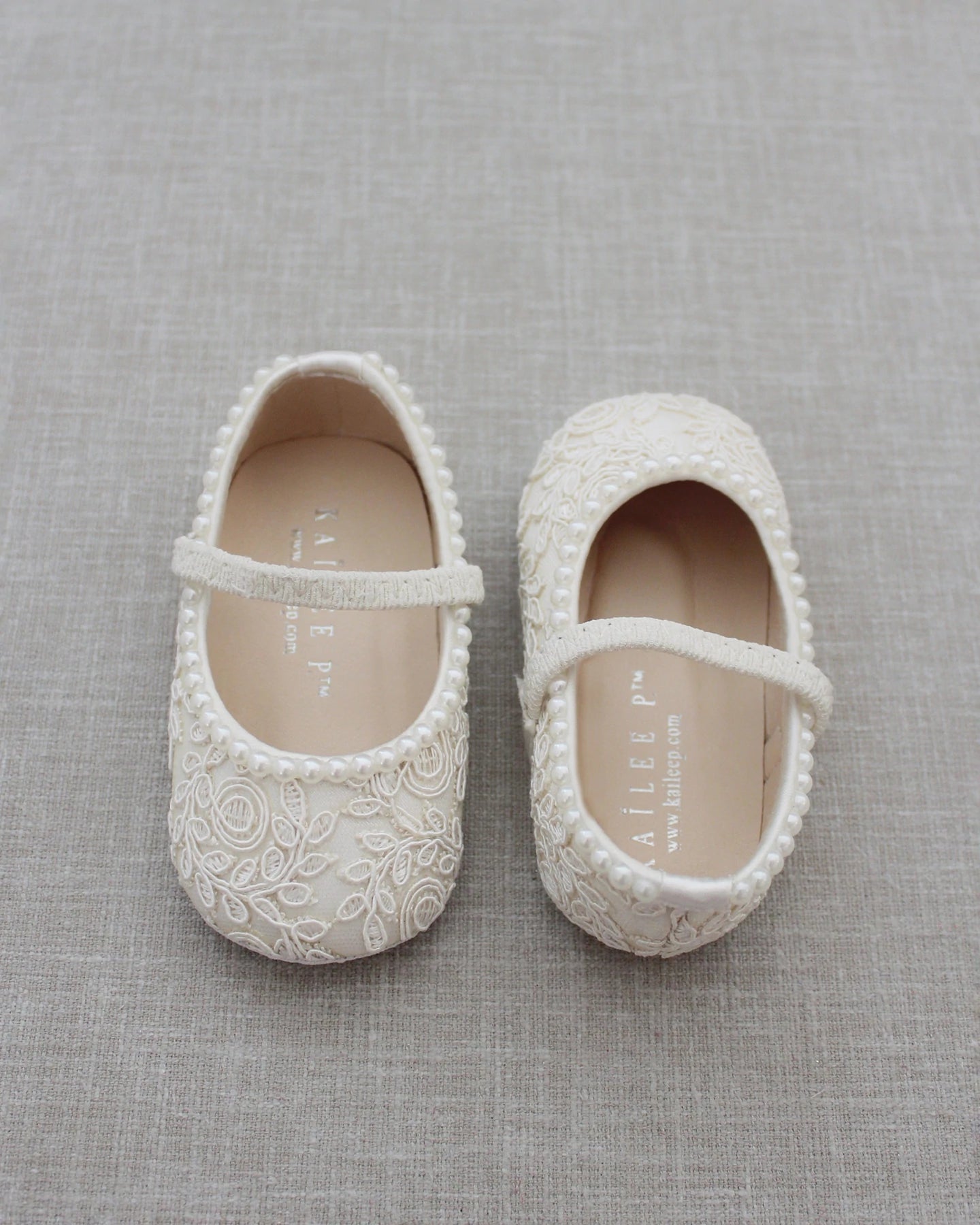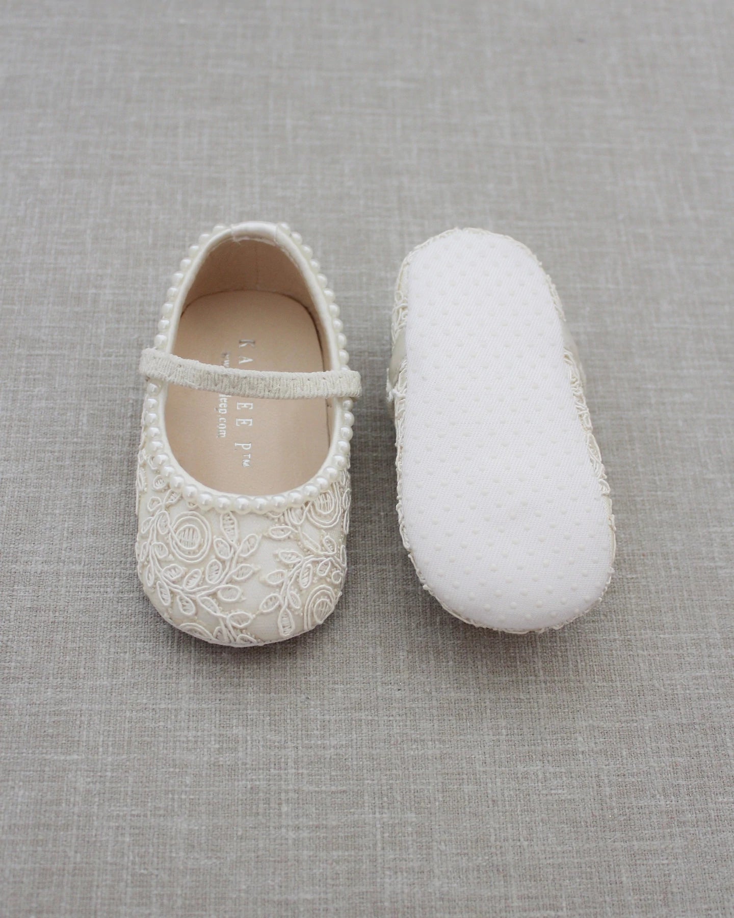 Hienostuneen herkällä köynnöskirjailulla sekä pienillä helmillä koristellut lasten kengät. Ihanat ristiäiskengät, nimiäiskengät tai kukkaistytön kengät.