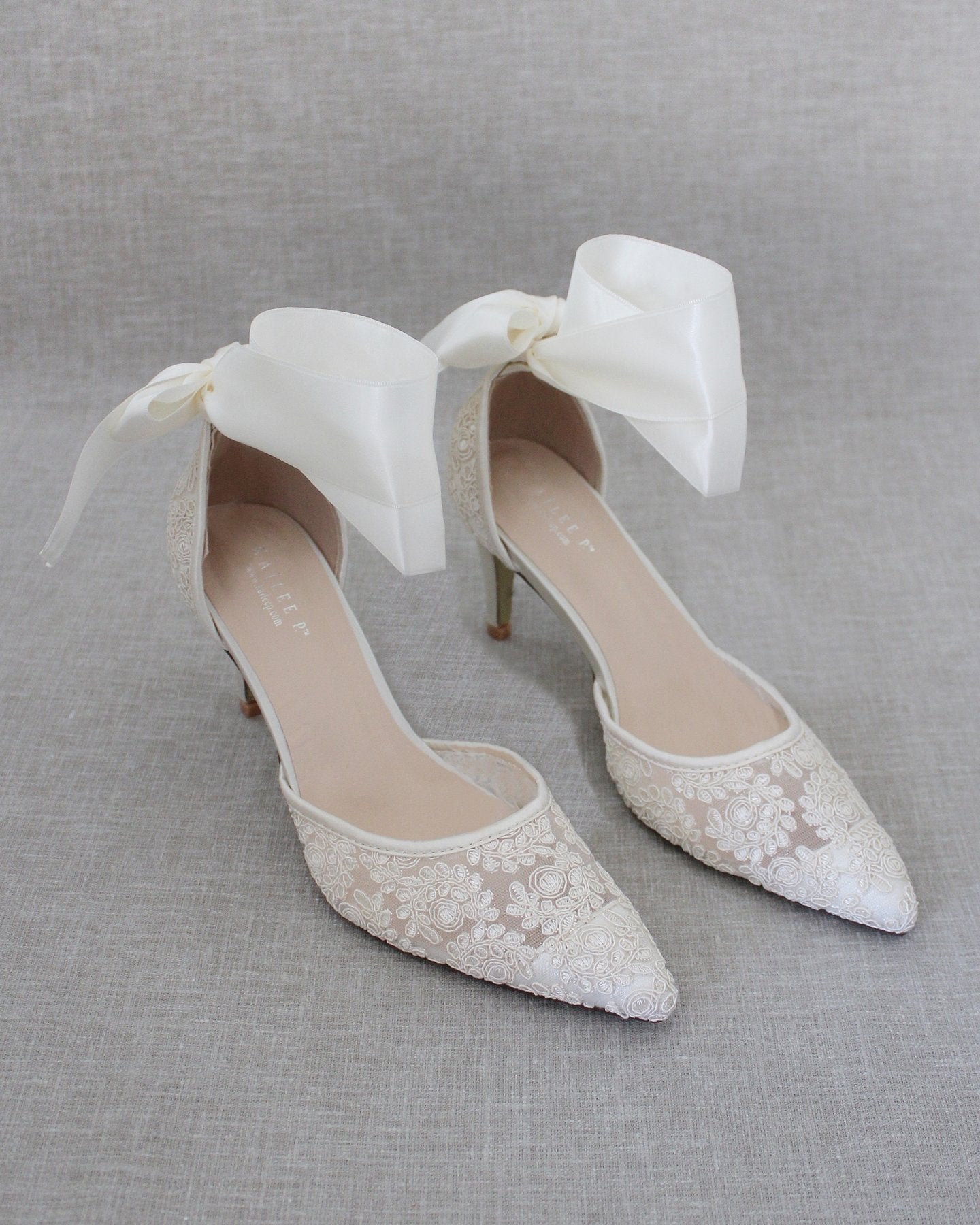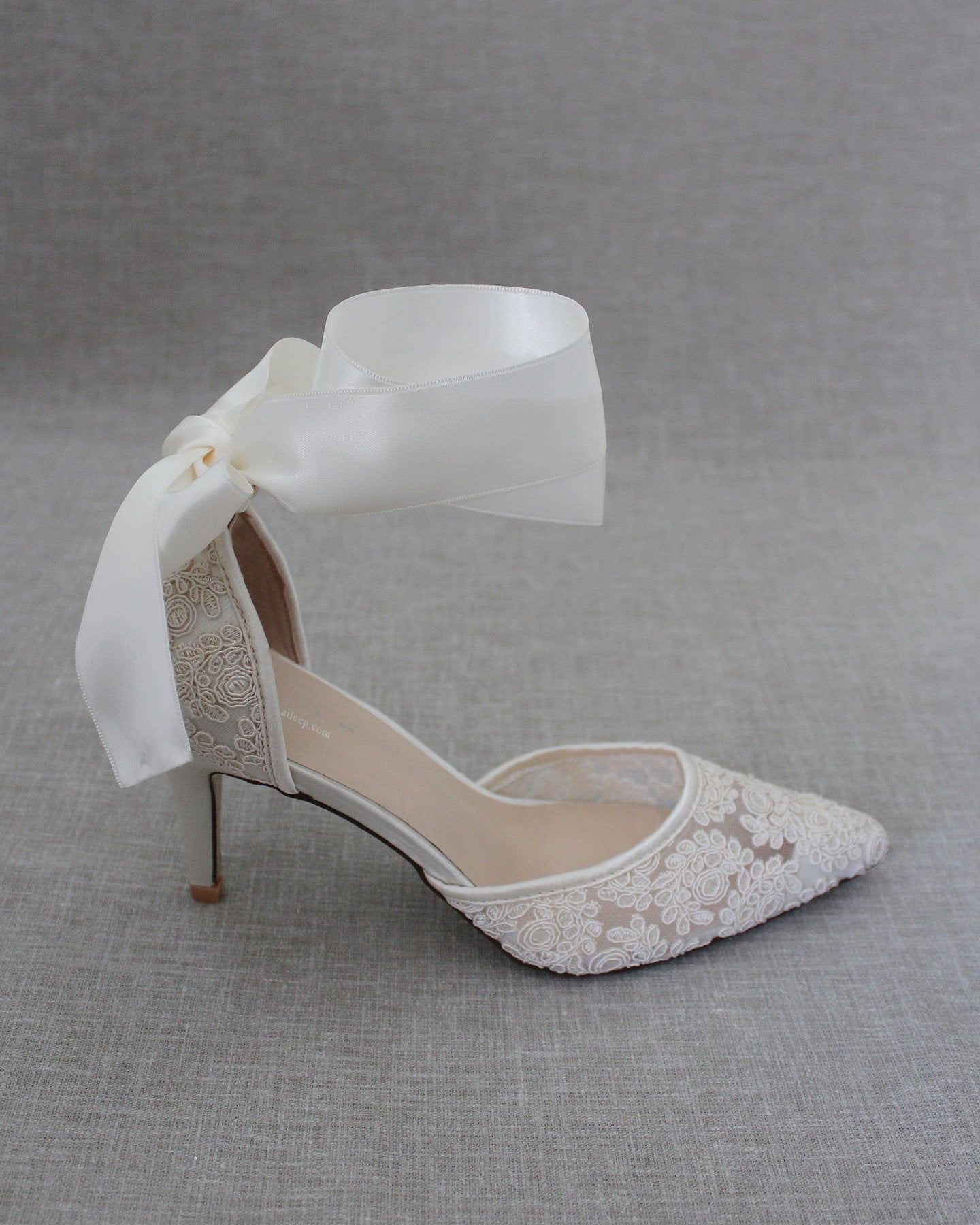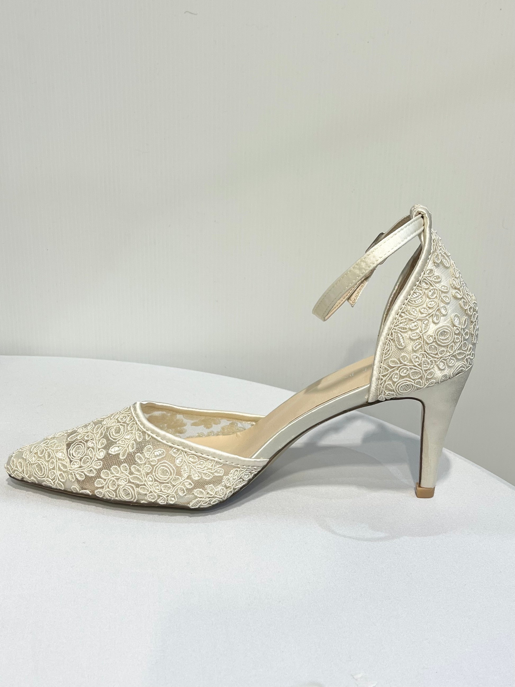 Hienostuneen herkällä köynnöskirjailulla koristellut teräväkärkiset korkokengät, joissa suloinen satiininen nilkkaremmi. Yksinkertaisen tyylikkäät juhlakengät tai hääkengät elämäsi tähtihetkiin.