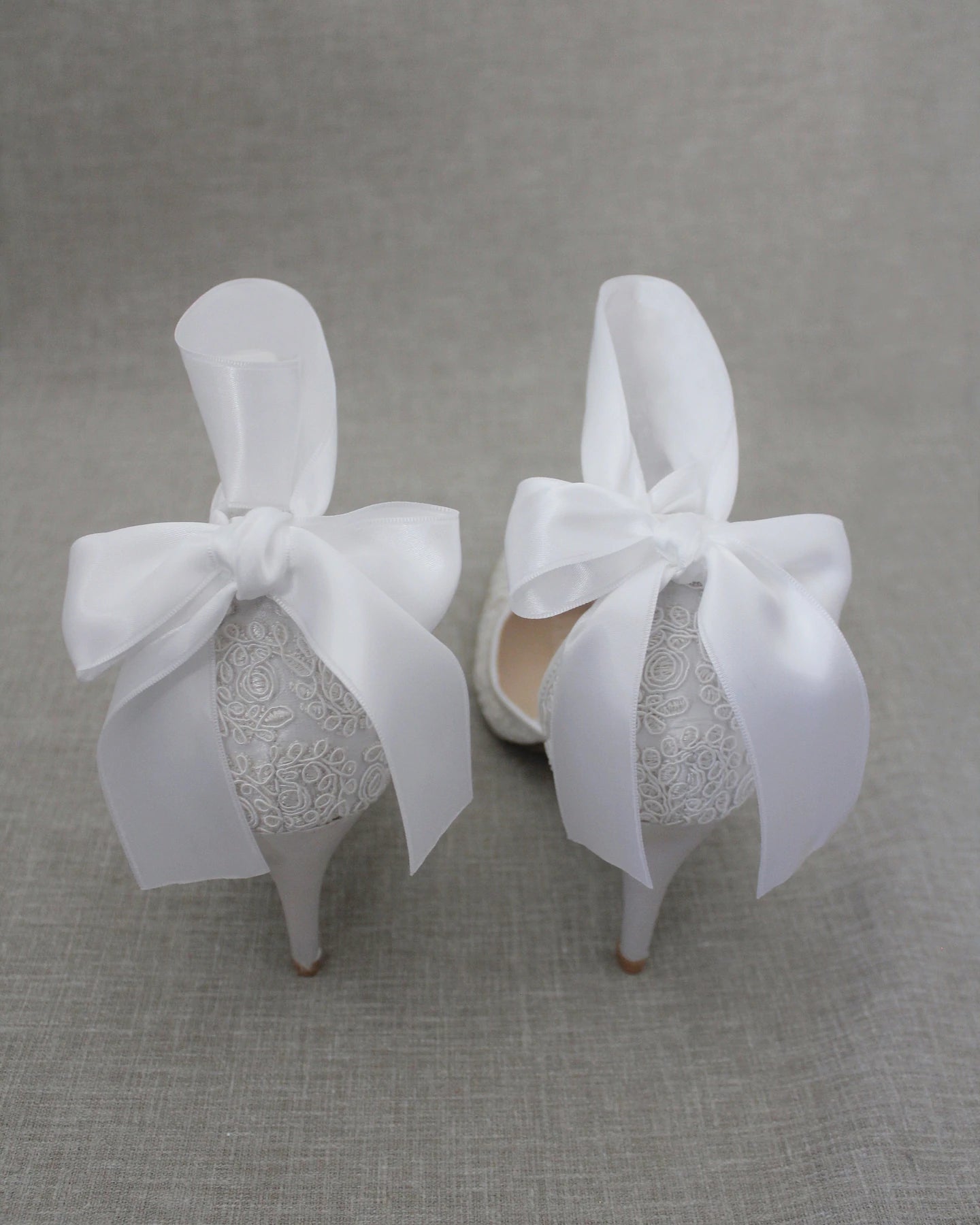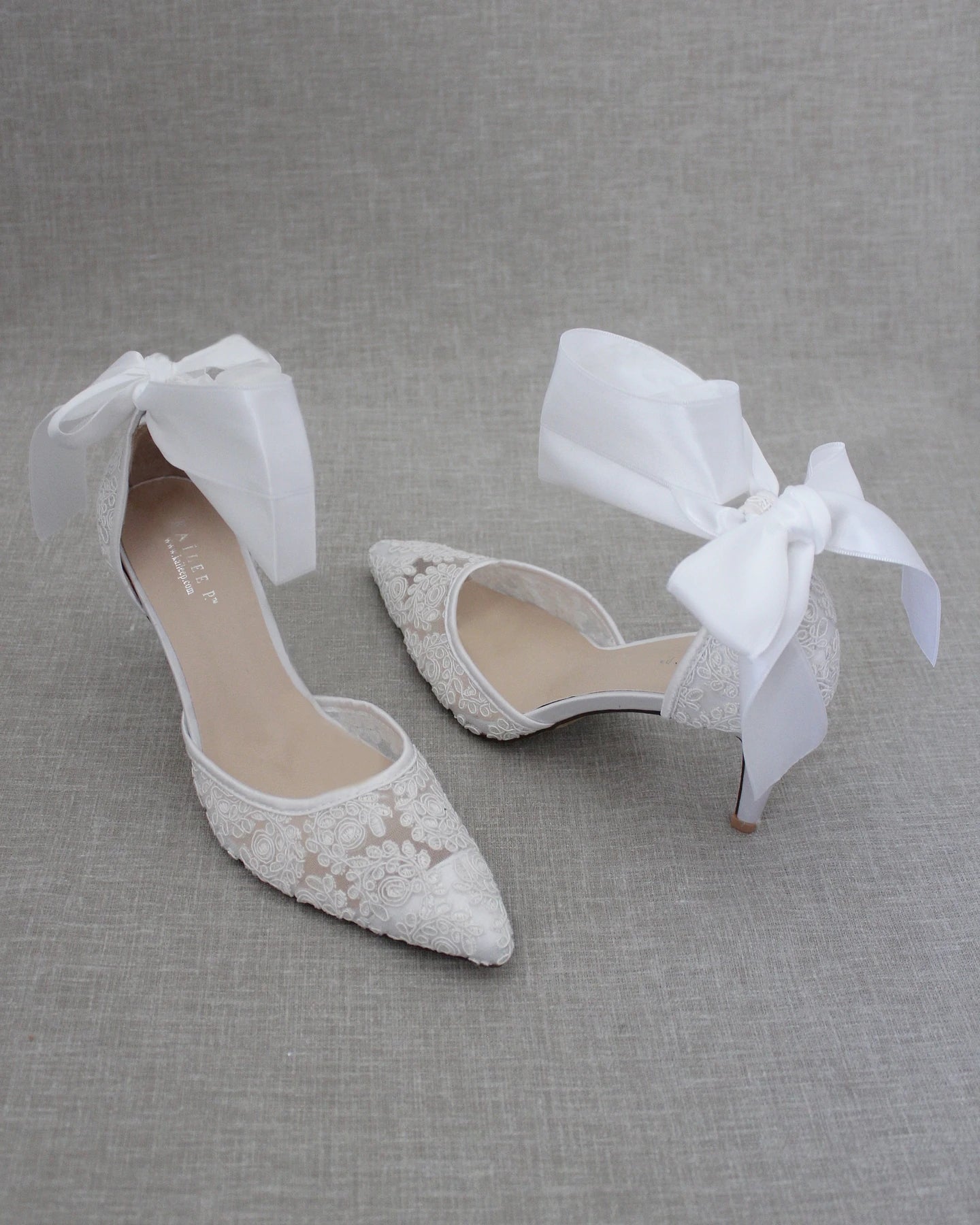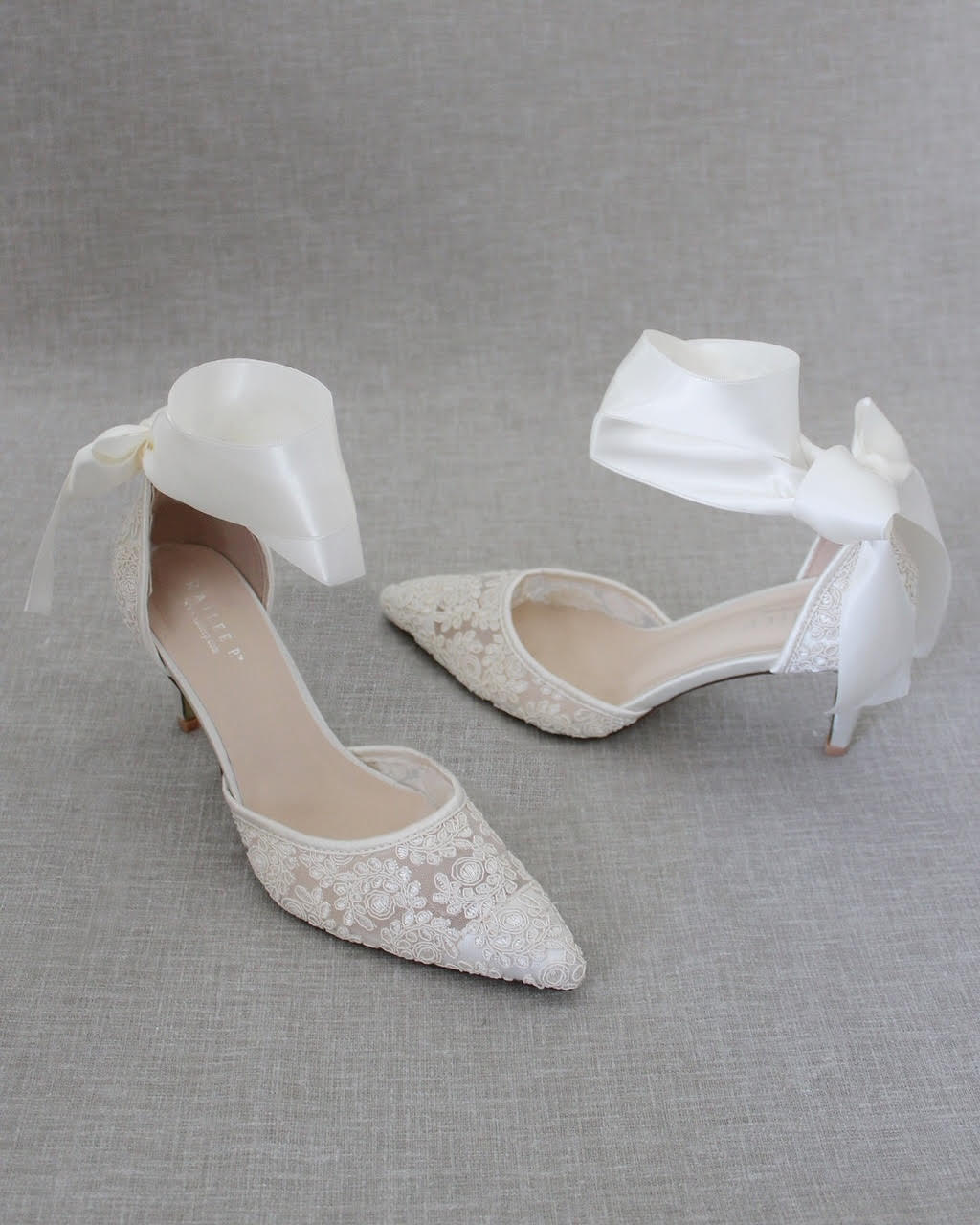 Hienostuneen herkällä köynnöskirjailulla koristellut teräväkärkiset korkokengät, joissa suloinen satiininen nilkkaremmi. Yksinkertaisen tyylikkäät juhlakengät tai hääkengät elämäsi tähtihetkiin.